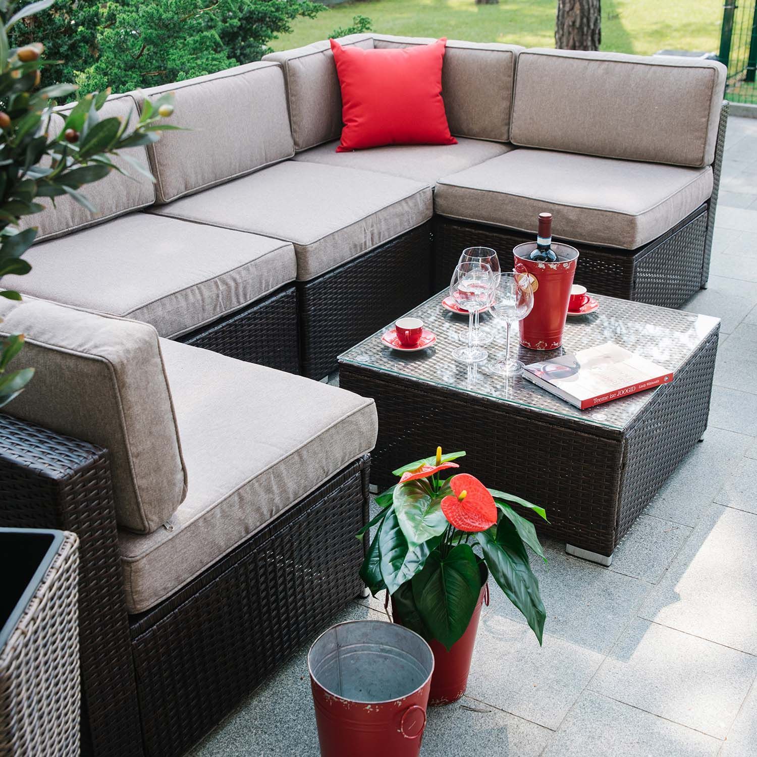 Aiamööblikomplekt CLIFF mooduldiivan ja laud. Komplekti kuulub 2 nurgamoodulit, 4 ilma käetugedeta vahemoodulit ja diivanilaud. Moodulite paigutust on võimalik muuta vastavalt soovile. Kõigi komplekti osade karkass on valmistatud alumiiniumist ja kaetud pruuni plastikpunutisega. Laua mõõdud on 68x68xH33,5cm, lauaplaat: 5mm läbipaistev karastatud klaas. Nurgamooduli mõõdud on 75x75xH63cm, vahemooduli mõõdud 65x75xH63cm. Komplekti kuulub 6 istmepatja 66x66x11cm, 6+2 seljatoepatja 66x32x11cm, 54x32x11cm, 2 punast diivanipatja 36x39cm. Kattematerjal: hallikasbeež polüesterkangas. Patjade täidis: poroloon/kiudpolüester. Padjakatted on eemaldatavad ja pestavad. Moodulite ühendusklambrid ei kuulu komplekti. Sobivad klambrid koodiga 12702 on võimalik eraldi juurde osta. Toode on muutlikes ilmastikutingimustes hästi vastupidav ja lihtsalt hooldatav. Kaitset ilmastikuolude eest vajavad ainult padjad. Hea lahendus patjade igapäevaseks hoiustamiseks ja kuivana hoidmiseks on padjakast. Välitingimustes kasutatava mööbli eluea pikendamiseks soovitame kasutada välimööbli katteid. HOIUSTAMINE: suvehooaja lõppedes soovitame aiamööblit hoiustada siseruumides. Puhastage ja kuivatage mööbel enne hoiule panekut. Kasutage hoiustamiseks kuiva ning hea ventilatsiooniga ruumi.