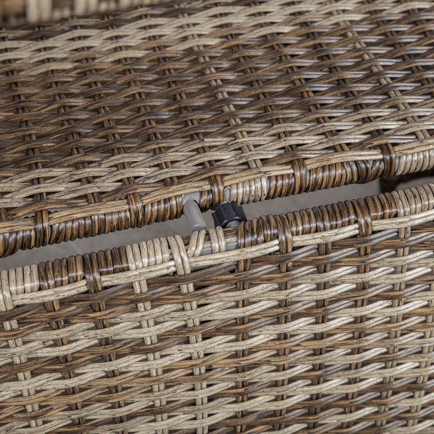 Aiamööblikomplekt ZURICH nurgadiivan ja muudetava kõrgusega laud. Diivani ja laua raam on valmistatud alumiiniumist ja kaetud pruunides toonides plastikpunutisega. Nurgadiivan koosneb kahest 3-kohalist moodulist mõõtudega 193x74xH73cm ja 184x74xH73cm. Diivani üldmõõdud on 193/258x74xH73cm. Istmekõrgus 44cm (koos padjaga). Käetoe kõrgus maast 63cm. Diivani juurde kuulub 2 istmepatja 174x65xH9cm ja 7 seljatoepatja. Padjakatted on valmistatud hallist polüesterkangast. Laua mõõdud on 117x70xH45/69cm, lauaplaat: 5mm must karastatud klaas. Toode on muutlikes ilmastikutingimustes hästi vastupidav ja lihtsalt hooldatav. Kaitset ilmastikuolude eest vajavad ainult padjad. Välitingimustes kasutatava mööbli eluea pikendamiseks soovitame kasutada välimööbli katteid. HOIUSTAMINE: suvehooaja lõppedes soovitame aiamööblit hoiustada siseruumides. Puhastage ja kuivatage mööbel enne hoiule panekut. Kasutage hoiustamiseks kuiva ning hea ventilatsiooniga ruumi.