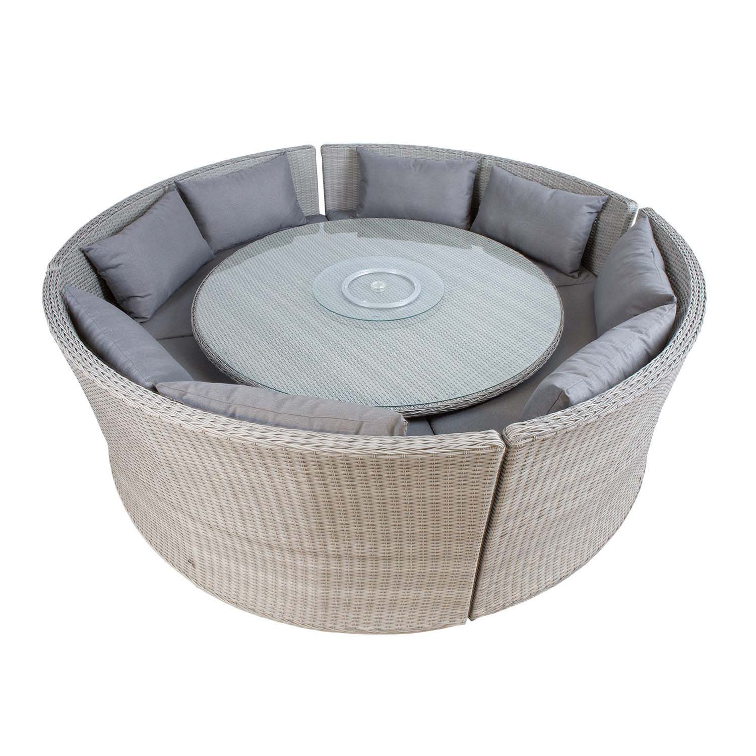Aiamööblikomplekt ASCOT muudetava kõrgusega laud ja 4 pinki, hall. Laua ja pinkide raamid on valmistatud alumiiniumist ja kaetud halli plastikpunutisega. Laua mõõdud on D160,5xH60/74,5cm, lauaplaat: 5mm karastatud läbipaistev klaas. Laua juurde kuulub pöörlev klaasist serveerimisalus D58cm. Laua ja serveerimisaluse keskel on auk (D4cm) päikesevarju jaoks. Poolkaare kujulise pingi üldmõõdud on 180,5x81xH89cm, istme kõrgus koos padjaga 49cm, istme sügavus 56cm. Komplekti kuulub 4 istmepatja ja 8 seljatoepatja 74x44cm, istmepadja paksus 5cm. Padjakatted on valmistatud hallist polüesterkangast. Padjakatted on eemaldatavad ja pestavad. Toode on muutlikes ilmastikutingimustes vastupidav ja väga lihtsalt hooldatav, kaitset ilmastikutingimuste eest vajavad ainult padjad. Välitingimustes kasutatava mööbli eluea pikendamiseks soovitame kasutada välimööbli katteid. HOIUSTAMINE: suvehooaja lõppedes soovitame aiamööblit hoiustada siseruumides. Puhastage ja kuivatage mööbel enne hoiule panekut. Kasutage hoiustamiseks kuiva ning hea ventilatsiooniga ruumi.