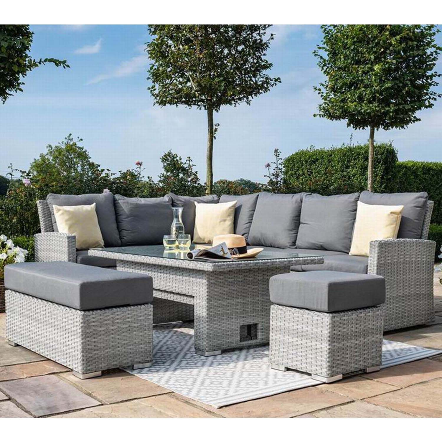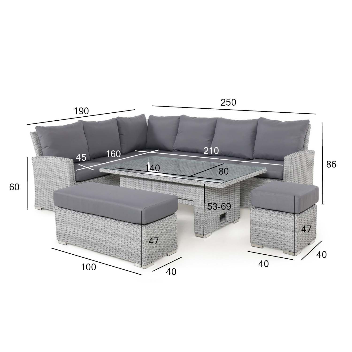 Aiamööblikomplekt ASCOT nurgadiivan, laud ja 2 tumbat, hall. Komplekti kuuluvad muudetava kõrgusega laud, kahest osast koosnev nurgadiivan ja 2 tumbat koos pehmete patjadega. Kõigi komplekti osade raamid on valmistatud alumiiniumist ja kaetud plastikpunutisega. Laua mõõdud on 140x80xH53-69cm, lauaplaat: 5mm karastatud läbipaistev klaas. Diivanite mõõdud on 177x73xH86cm, 190x73xH86cm. Tumbade mõõdud 40x40xH47cm, 100x40xH47cm (kõrgus koos padjaga). Diivani juurde kuulub 6 istmepatja mõõtudega 58x57xH10cm, 7 seljatoepatja mõõtudega 58x46x15cm. Tumbade padjad 40x40x15cm ja 100x40x15cm. Padjakatted on valmistatud hallist olefin kangast. Toode on muutlikes ilmastikutingimustes vastupidav ja väga lihtsalt hooldatav, kaitset ilmastikutingimuste eest vajavad ainult padjad. Välitingimustes kasutatava mööbli eluea pikendamiseks soovitame kasutada välimööbli katteid. HOIUSTAMINE: suvehooaja lõppedes soovitame aiamööblit hoiustada siseruumides. Puhastage ja kuivatage mööbel enne hoiule panekut. Kasutage hoiustamiseks kuiva ning hea ventilatsiooniga ruumi.