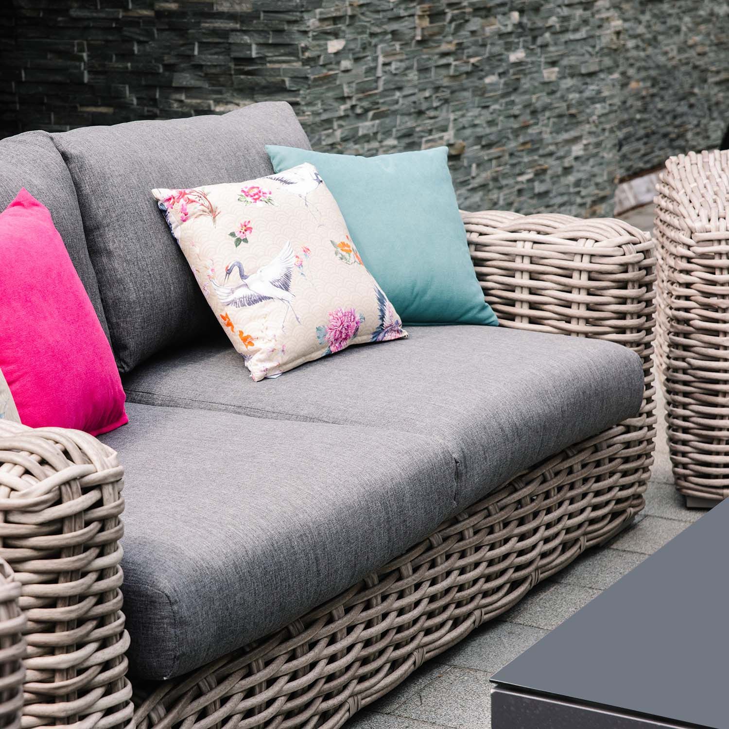 Aiamööblikomplekt CALISTA laud, diivan ja 2 tooli, hall. Diivani ja tugitoolide alumiiniumraamid on kaetud efektse plastikpunutisega. Laua mõõdud on 160x80xH36cm, lauaplaat: 5mm taustvärvitud hall karastatud klaas. Laua jalad ja raam on valmistatud alumiiniumist ja viimistletud halli pulbervärviga. Diivani mõõdud on 220x112xH67cm, tugitooli mõõdud on 137x112xH67cm. Padjad kuuluvad komplekti. Padjakatted on valmistatud hallist polüesterkangast. Istmepatjade paksus 16cm. Toode on muutlikes ilmastikutingimustes vastupidav ja väga lihtsalt hooldatav, kaitset ilmastikutingimuste eest vajavad ainult padjad. Välitingimustes kasutatava mööbli eluea pikendamiseks soovitame kasutada välimööbli katteid. HOIUSTAMINE: suvehooaja lõppedes soovitame aiamööblit hoiustada siseruumides. Puhastage ja kuivatage mööbel enne hoiule panekut. Kasutage hoiustamiseks kuiva ning hea ventilatsiooniga ruumi.