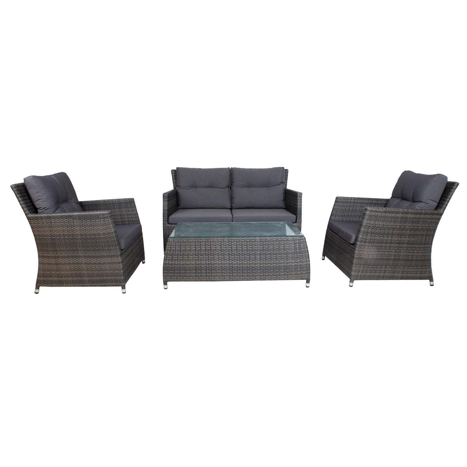 Aiamööblikomplekt ADENA laud, diivan ja 2 tugitooli, hallikaspruun. Komplekti kõikide osade raamid on valmistatud alumiiniumist ja kaetud hallikaspruuni plastikpunutisega. Laua mõõdud on 116x61xH42cm, lauaplaat: 5mm karastatud klaas 104x49cm. Diivani mõõdud 142x75xH82cm, tugitooli mõõdud 70x72xH82cm. Istme kõrgus raamini 32,5cm, koos padjaga 40,5cm. Käetugede kõrgus maast 63,5cm. Padjakatted on valmistatud hallist polüesterkangast. Komplekti kuulub 2 diivani istmepatja 65x60x8cm, 2 tugitooli istmepatja 58x60x8cm, 2 diivani seljatoepatja 65x52x12cm, 2 tugitooli seljatoepatja 55x52x12cm. Toode on muutlikes ilmastikutingimustes hästi vastupidav ja lihtsalt hooldatav. Kaitset ilmastikuolude eest vajavad ainult padjad. Hea lahendus patjade igapäevaseks hoiustamiseks ja kuivana hoidmiseks on padjakast. Välitingimustes kasutatava mööbli eluea pikendamiseks soovitame kasutada välimööbli katteid. HOIUSTAMINE: suvehooaja lõppedes soovitame aiamööblit hoiustada siseruumides. Puhastage ja kuivatage mööbel enne hoiule panekut. Kasutage hoiustamiseks kuiva ning hea ventilatsiooniga ruumi.