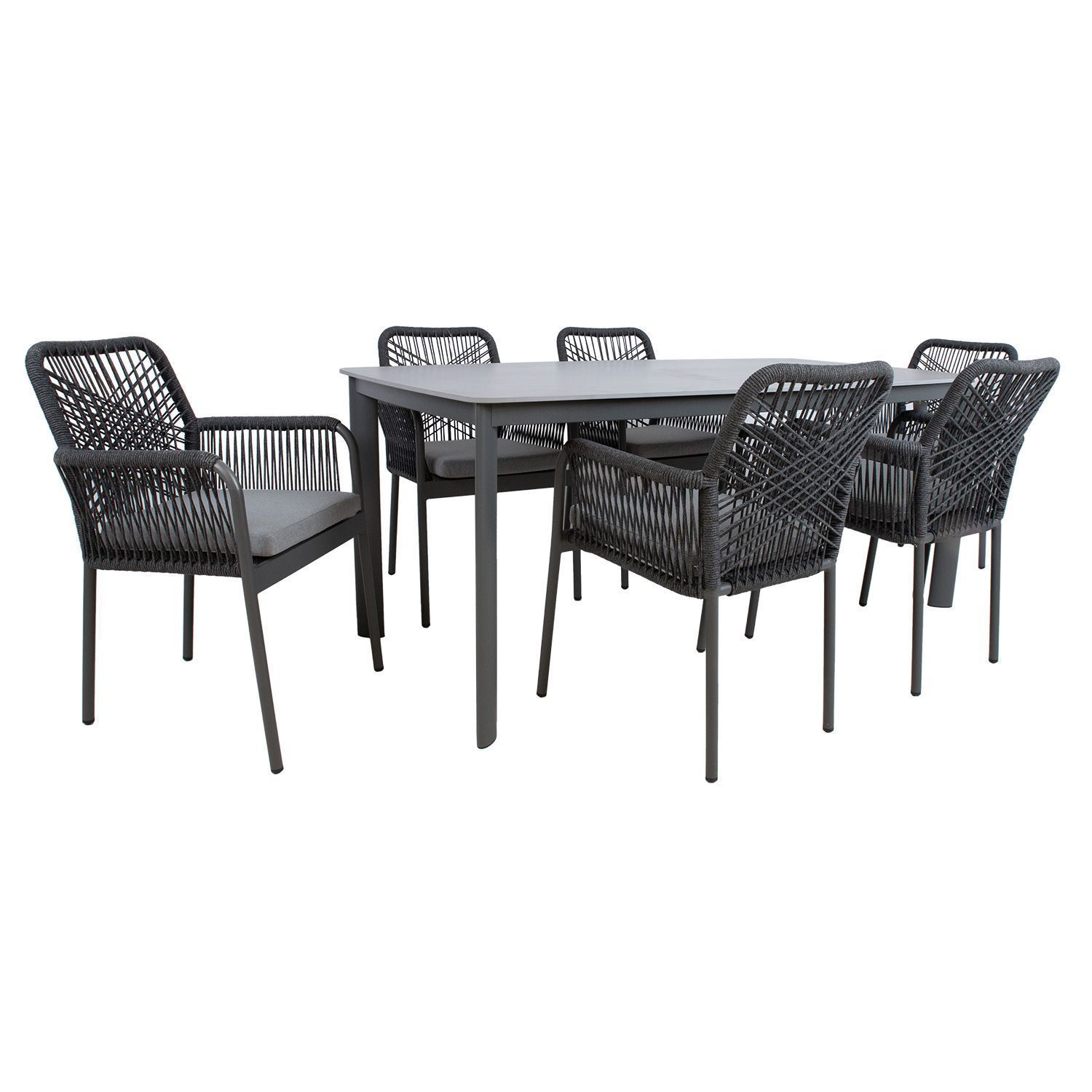 Aiamööblikomplekt BEIDA laud ja 6 tooli. Laua mõõdud on 180x90xH75cm. Lauaplaat: 11mm paagutatud kivi. Paagutatud kivist (sintered stone) lauaplaadi valmistamisel on kasutatud innovatiivset tehnoloogiat, mis jäljendab loodusliku kivi moodustumise protsessi sügaval maakoores. Kaoliini ehk portselansavi osakesed töödeldakse 1200 kraadises kuumuses, mille tulemusena moodustub materjal, mis oma omadustel ja välimuselt sarnaneb naturaalse kiviga. Lauaplaat on küll õhuke, kuid väga tugev (suhteline kõvadus Mohsi skaalal 7), kulumiskindel, talub hästi kõrget temperatuuri ja erinevaid ilmastikutingimusi, ei ima plekke ja seda on väga lihtne puhastada ja hooldada. Kuna keemilisi sideaineid ei ole kasutatud on materjal hügieeniline. TÄHELEPANU! Vältige lööke, põrutusi ja kukkumist. Laua ja toolide jalad ja raam on valmistatud alumiiniumist ja viimistletud halli pulbervärviga. Tooli selja- ja käetoed on kaetud pilkupüüdva olefin nöörist punutisega. Istmepadi kuulub komplekti. Padjakate on valmistatud polüesterkangast. Padja paksus 5cm. Istmepõhi on toestatud alumiiniumliistudega. Tooli mõõdud 57x60xH89cm, istmekõrgus 44cm. Kaalupiirang 100kg. Toolid on virnastatavad ning nende hoiustamine on lihtne ja ruumi säästev. Toode on muutlikes ilmastikutingimustes vastupidav ja lihtsalt hooldatav. Välitingimustes kasutatava mööbli eluea pikendamiseks soovitame kasutada välimööbli katteid. HOIUSTAMINE: suvehooaja lõppedes soovitame aiamööblit hoiustada siseruumides. Puhastage ja kuivatage mööbel enne hoiule panekut. Kasutage hoiustamiseks kuiva ning hea ventilatsiooniga ruumi.