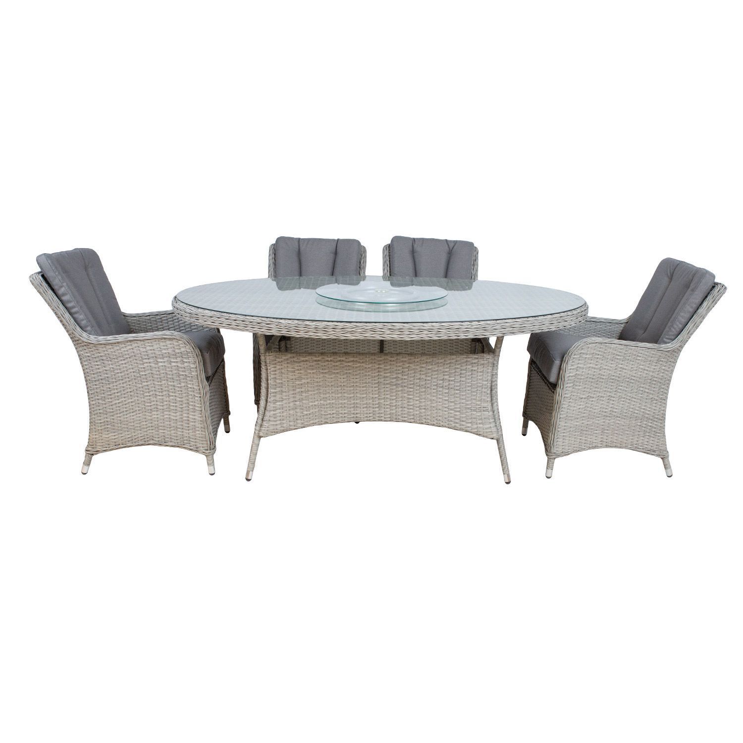 Aiamööblikomplekt ASCOT laud ja 6 tooli. Laua mõõdud on 180x120xH75cm. Laua ja toolide raamid on valmistatud alumiiniumist ja kaetud halli plastikpunutisega. Lauaplaat: 8mm karastatud läbipaistev klaas. Lauaga komplekti kuulub pöörlev klaasist serveerimisalus D60cm. Laua ja serveerimisaluse keskel on auk (D4cm) päikesevarju jaoks. Tugitooli mõõdud on 58x70xH90cm. Istme laius 48cm, istme sügavus 49cm, istmekõrgus koos padjaga 54cm. Käetoe kõrgus maast 66cm. Padjad kuuluvad komplekti. Padjakatted on valmistatud hallist polüesterkangast. Istmepadja mõõdud on 48x49xH13cm, seljatoepadja mõõdud 50x45x5cm. Toode on muutlikes ilmastikutingimustes vastupidav ja väga lihtsalt hooldatav, kaitset ilmastikutingimuste eest vajavad ainult padjad. Välitingimustes kasutatava mööbli eluea pikendamiseks soovitame kasutada välimööbli katteid. HOIUSTAMINE: suvehooaja lõppedes soovitame aiamööblit hoiustada siseruumides. Puhastage ja kuivatage mööbel enne hoiule panekut. Kasutage hoiustamiseks kuiva ning hea ventilatsiooniga ruumi.