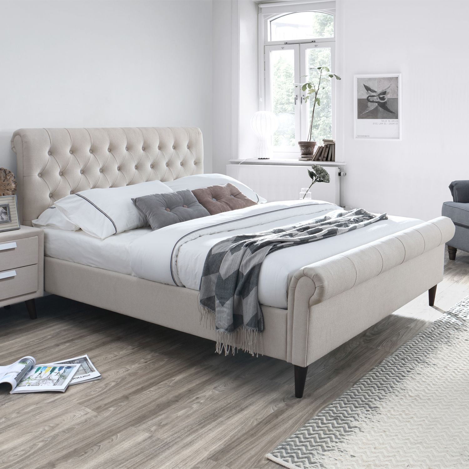 Voodi LUCIA 160x200cm, beež. Voodi korpus on valmistatud MDF plaadist ja kaetud beeži polüesterkangaga. Voodil on täispuidust jalad, mis on cappuccino tooni. Komplekt sisaldab voodi peatsit ja põhjalippe. Madrats ei kuulu komplekti. Sobiv madrats on mõõtudega 160x200cm. Toote mõõdud on 167,5x234xH110cm.