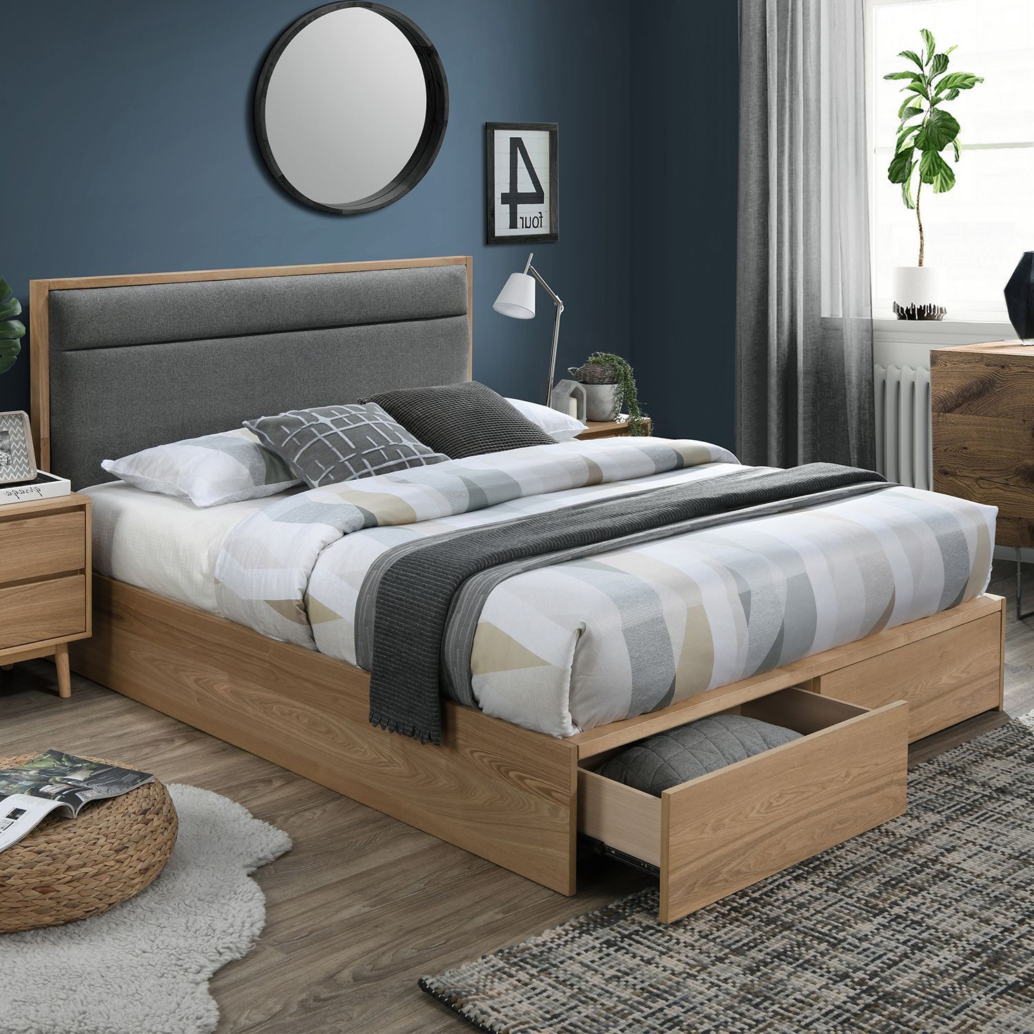 Voodi BLOSSOM 160x200cm, tumehall/tamm. Voodi alusraami sees asuvad ruumikad panipaigad. Sahtlitesse saab mugavalt mahutada nii tekid, padjad kui muu vajaliku. Kaks sahtlit asuvad voodi jalutsi pool. Voodi korpus on valmistatud MDF plaadist ja kaetud naturaalse saarespooniga. Korpus on viimistletud tamme toonis lakiga. Peatsi polsterdatud osa on kaetud tumehalli polüesterkangaga. Komplekt sisaldab voodi põhjalippe. Madrats ei kuulu komplekti. Sobiva madratsi mõõdud on 160x200cm. Voodi üldmõõdud on 165,5x208xH105cm.