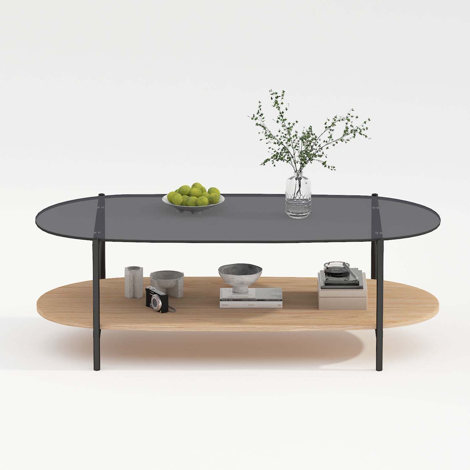 Diivanilaud CINDY 120x55xH40cm, hall klaas/melamiin tamm. Lauaplaat: hall karastatud klaas. Alumine riiul: hele tammedekooriga melamiinplaat. Laua jalad ja raam on valmistatud metallist ja viimistletud musta pulbervärviga.