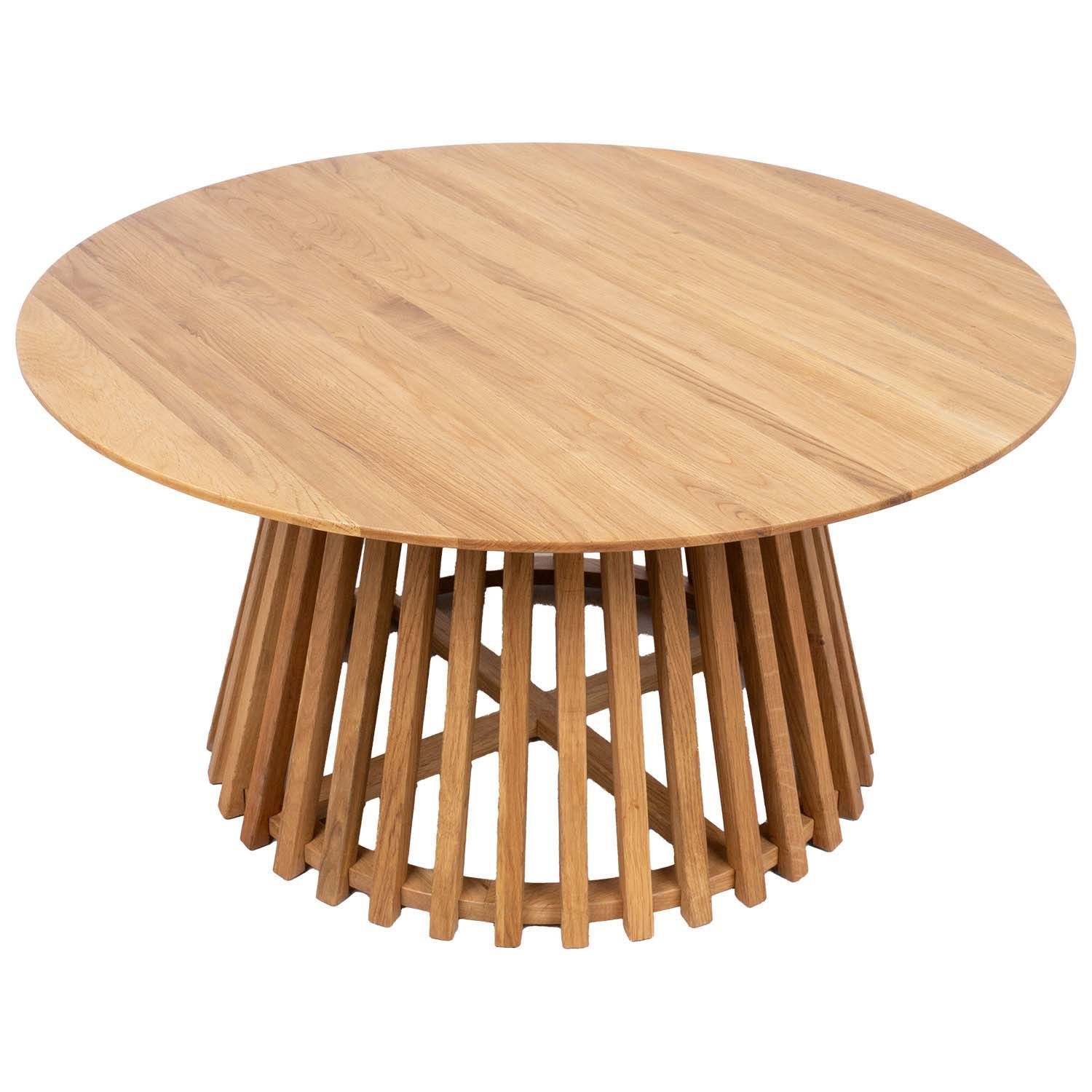 Diivanilaud SLATTED D80xH40cm, jalakas. Lauaplaat on valmistatud jalaka puidust. Lauaplaadi paksus on 25mm. Laua ümmargune alus on kaetud kitsaste puidust liistudega. Puidupinnad on lakitud.