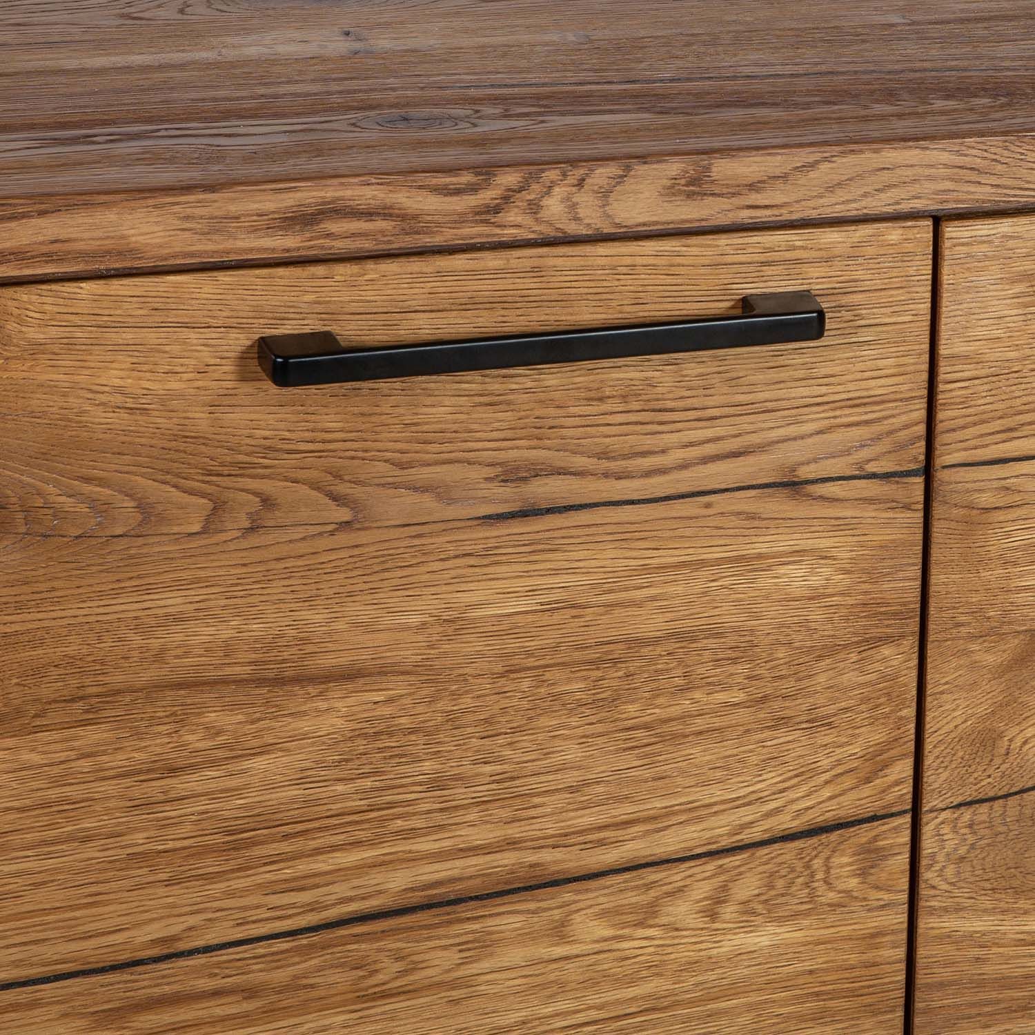 Kummut ROTTERDAM 3-sahtli ja 2-uksega 175x45xH73cm, tamm. Kummuti väliskorpus, uksed ja sahtlite esipaneelid on valmistatud mööbliplaadist ja kaetud naturaalse rustik tammespooniga. Rustik spoon on kirju ja elava struktuuriga. Suured oksakohad, pahteldatud lõhed ja rohke tooni varieerumine on lubatud. Kummut on viimistletud õliga. Sahtlid liiguvad puidust siinidel. Kahe poolega kapi mõlema ukse taga on üks vaheriiul. Kummuti alusraam on valmistatud metallist ja viimistletud musta pulbervärviga. Jalgade kõrgus 15cm.