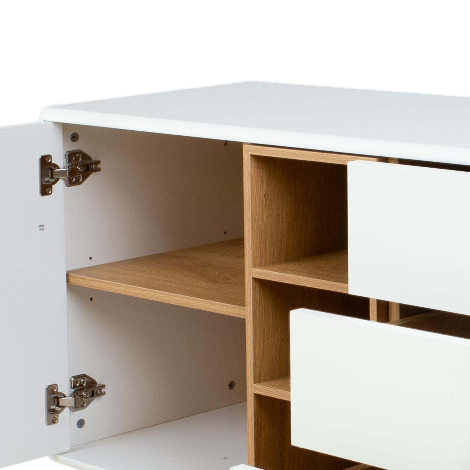 Kummut IRIS 2-sahtli ja uksega 140x40xH55cm, valge. Kummut on valmistatud 18mm MDF plaadist. Jalad ja alusraam on valmistatud täispuidust. Kummut on viimistletud vastupidava polüuretaanvärviga. Sahtlitel on nahast käepidemed. Avatud vaheriiul on vooderdatud heleda puiduvärvi plaadiga. Kummutil on ümarad välisservad.