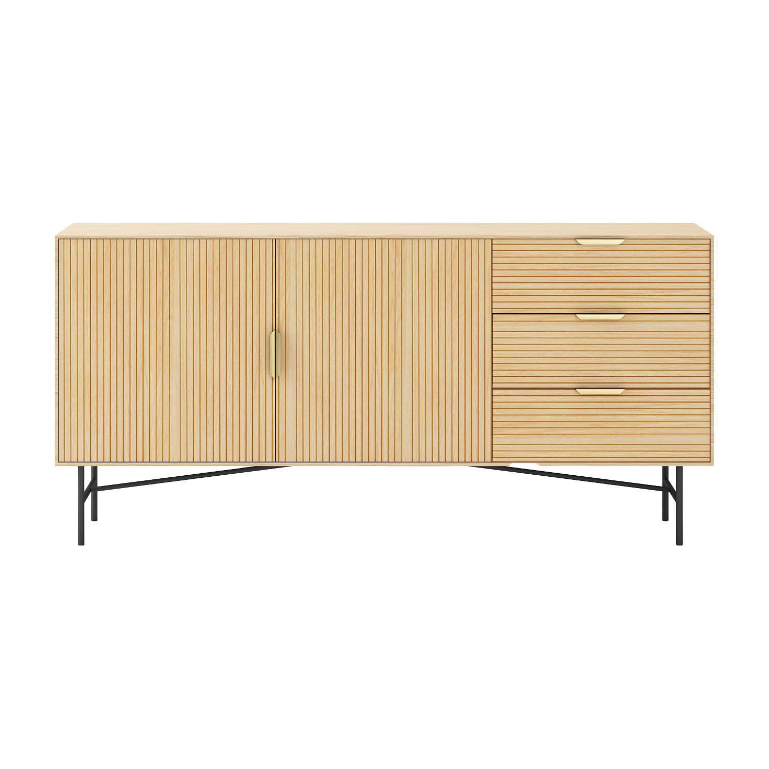 Kummut BASSEL 2-ukse ja 3-sahtliga 160x40H75cm, 3D melamiin. Kummut on valmistatud heleda puidudekooriga melamiinplaadist. Ribilised esipaneelid ja kuldsed käepidemed annavad kummutile trendika välimuse. Metallist jalad ja alusraam on viimistletud musta pulbervärviga.