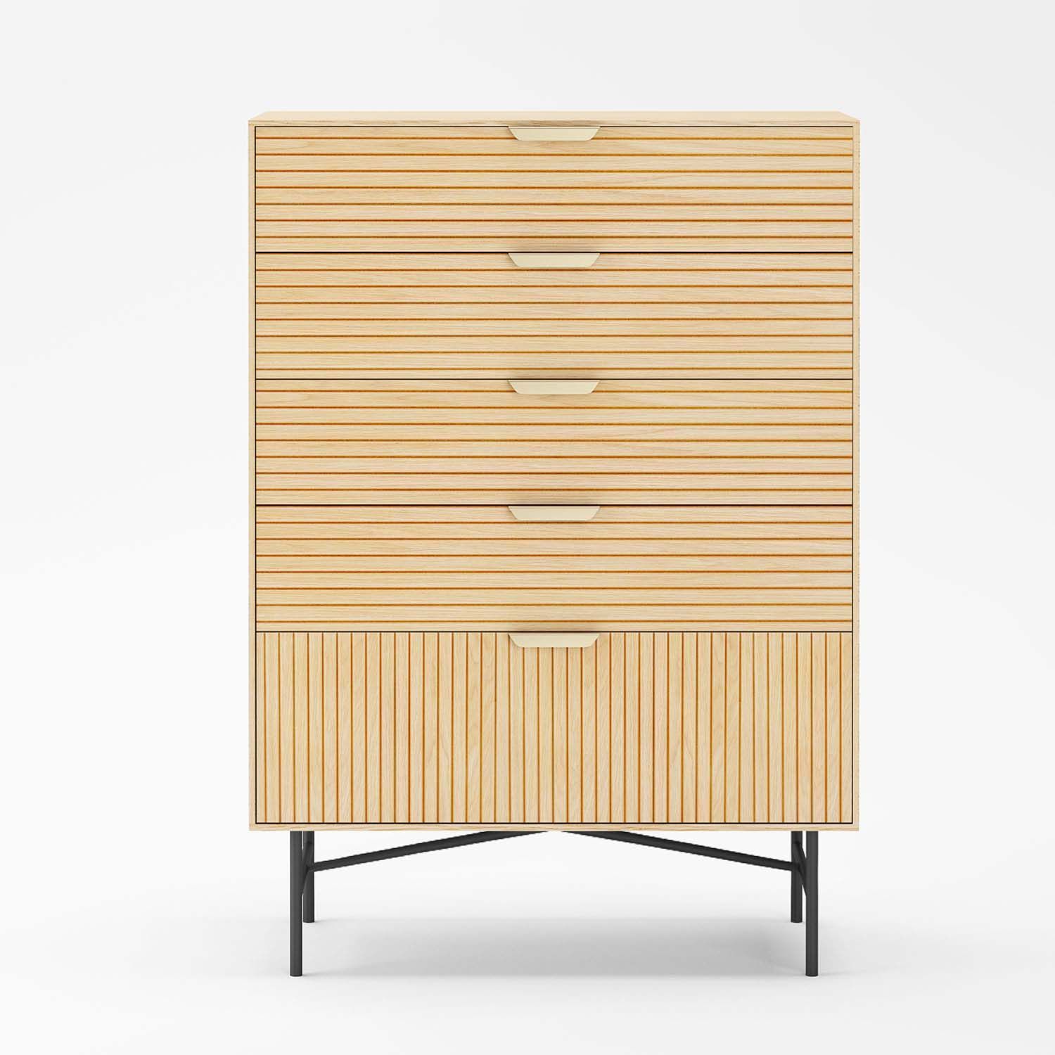Kummut BASSEL 5-sahtliga 80x40xH114cm, 3D melamiin. Kummut on valmistatud heleda puidudekooriga melamiinplaadist. Erisuunalised, ribilised esipaneelid ja kuldsed käepidemed annavad kummutile trendika välimuse. Metallist jalad ja alusraam on viimistletud musta pulbervärviga.