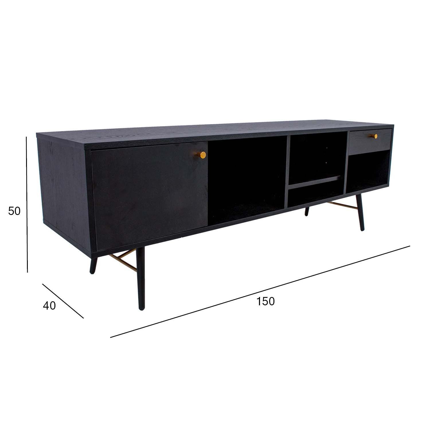 TV-laud LUXEMBOURG 150x40xH50cm, must melamiin. TV-laud on valmistatud puidudekooriga melamiinkattega mööbliplaadist. Lauajalgu seovad vasevärvi metallist detailid, mis annavad lauale stiilse välimuse ja samas tagavad aluskonstruktsiooni tugevuse. TV-laual on üks uksega kapp, üks sahtel ja 4 erinevas mõõdus avatud riiulivahet. Uksehinged ja sahtlisiinid on vaikselt sulguvad. Sahtli- ja uksenupud on vasevärvi alumiiniumist. Lauajalgade kõrgus on 20cm.