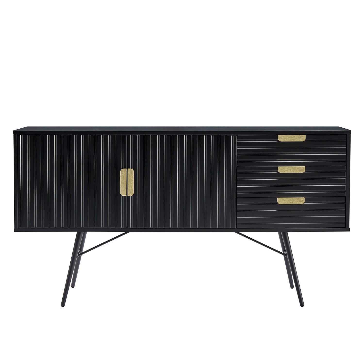Kummut PIXAR 3-sahtli ja 2-uksega 150x40xH80cm, must. Mööbliplaadist valmistatud kummut on viimistletud musta polüuretaanvärviga. Ribipaneelist uksed ja sahtlite esipaneelid ning kuldsed käepidemed annavad kummutile pilkupüüdva välimuse. Kummuti jalad ja alusraam on valmistatud metallist.