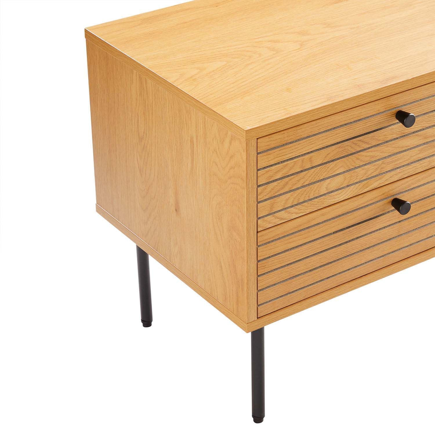 Öökapp LINE 2-sahtliga 50x40xH50cm. Öökapp on valmistatud tammedekooriga melamiinplaadist. Efektsed reljeefse pinnaga triibulised sahtlite esipaneelid on valmistatud mustast MDF plaadist, mida kaunistavad tammevärvi kitsad liistud. Öökapi metallist jalad on viimistletud musta pulbervärviga.