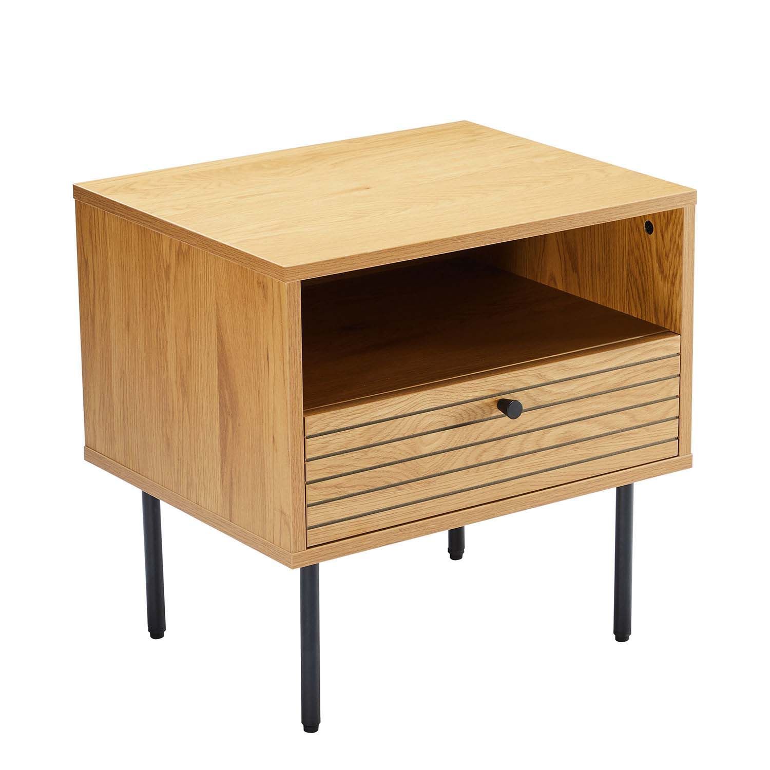 Öökapp LINE sahtli ja riiuliga 50x40xH50cm. Öökapp on valmistatud tammedekooriga melamiinplaadist. Efektse reljeefse pinnaga triibuline sahtli esipaneel on valmistatud mustast MDF plaadist, mida kaunistavad tammevärvi kitsad liistud. Öökapi metallist jalad on viimistletud musta pulbervärviga.