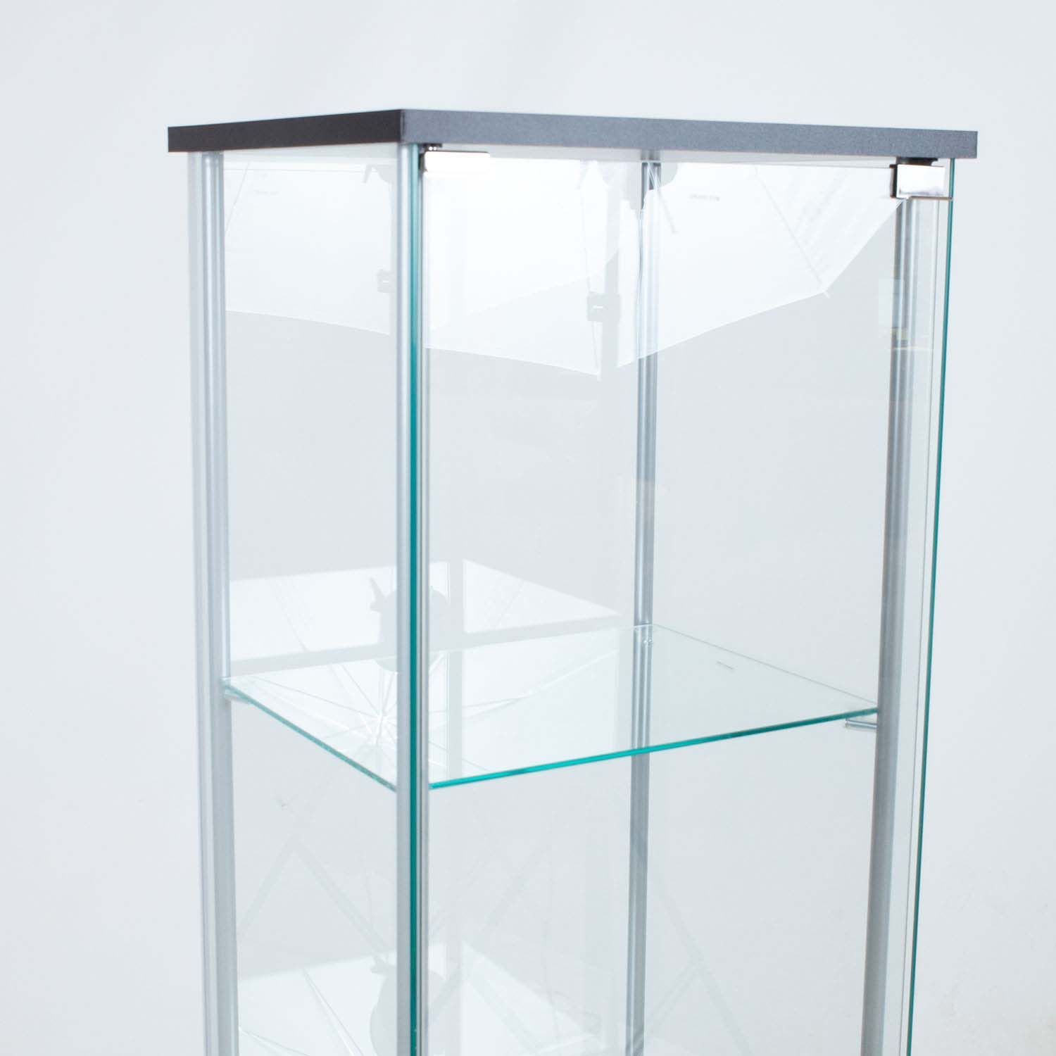 Vitriinkapp AIKO 42x36xH161cm. Õhulise klaasist vitriinkapi küljepostideks on hõbedased metalltorud. Vitriinkapi alus ja katus on valmistatud mustast lamineetplaadist. Kõik seinad, uks ja 3 vaheriiulit on tehtud 5mm karastatud klaasist.