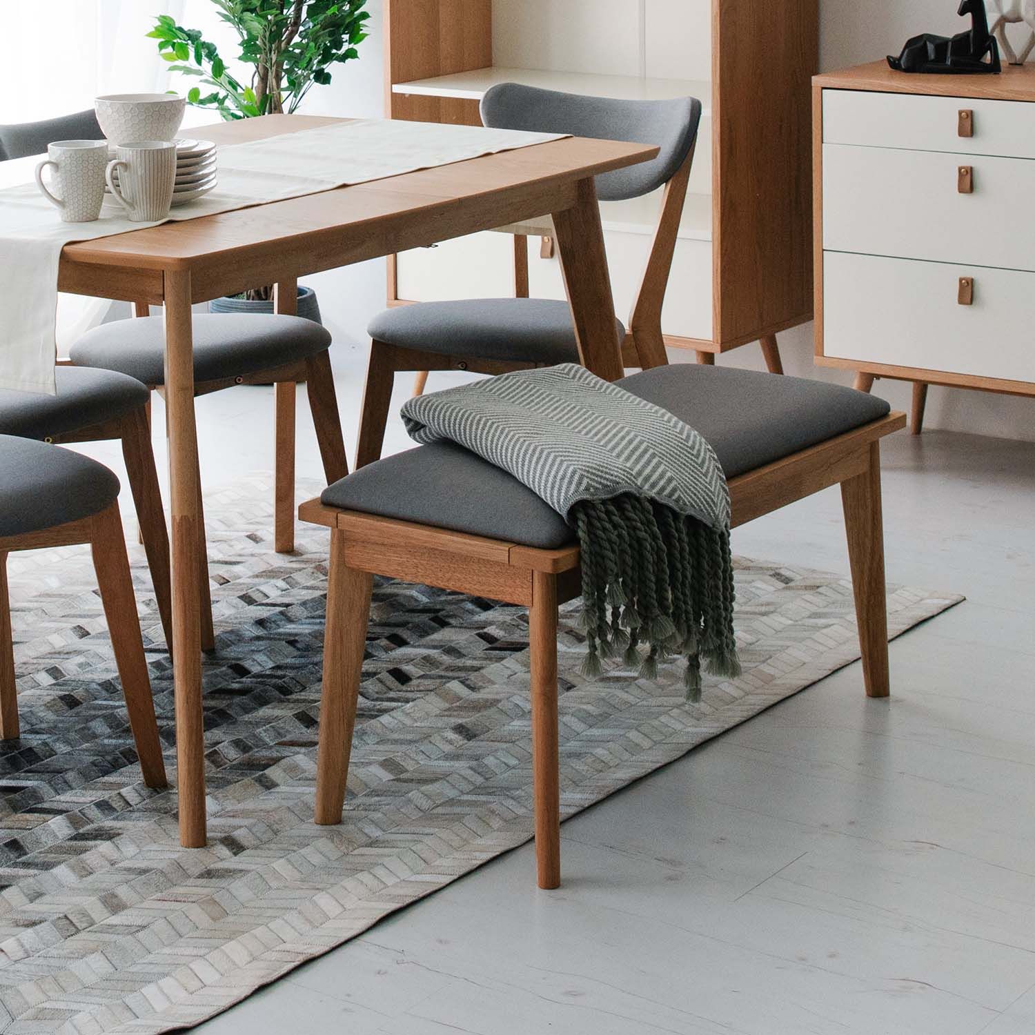 Pink JONNA 92x40xH45cm. Pingi kergelt polsterdatud iste on kaetud halli polüesterkangaga. Pingi jalad ja raam on valmistatud kummipuust ja viimistletud tamme toonis lakiga.