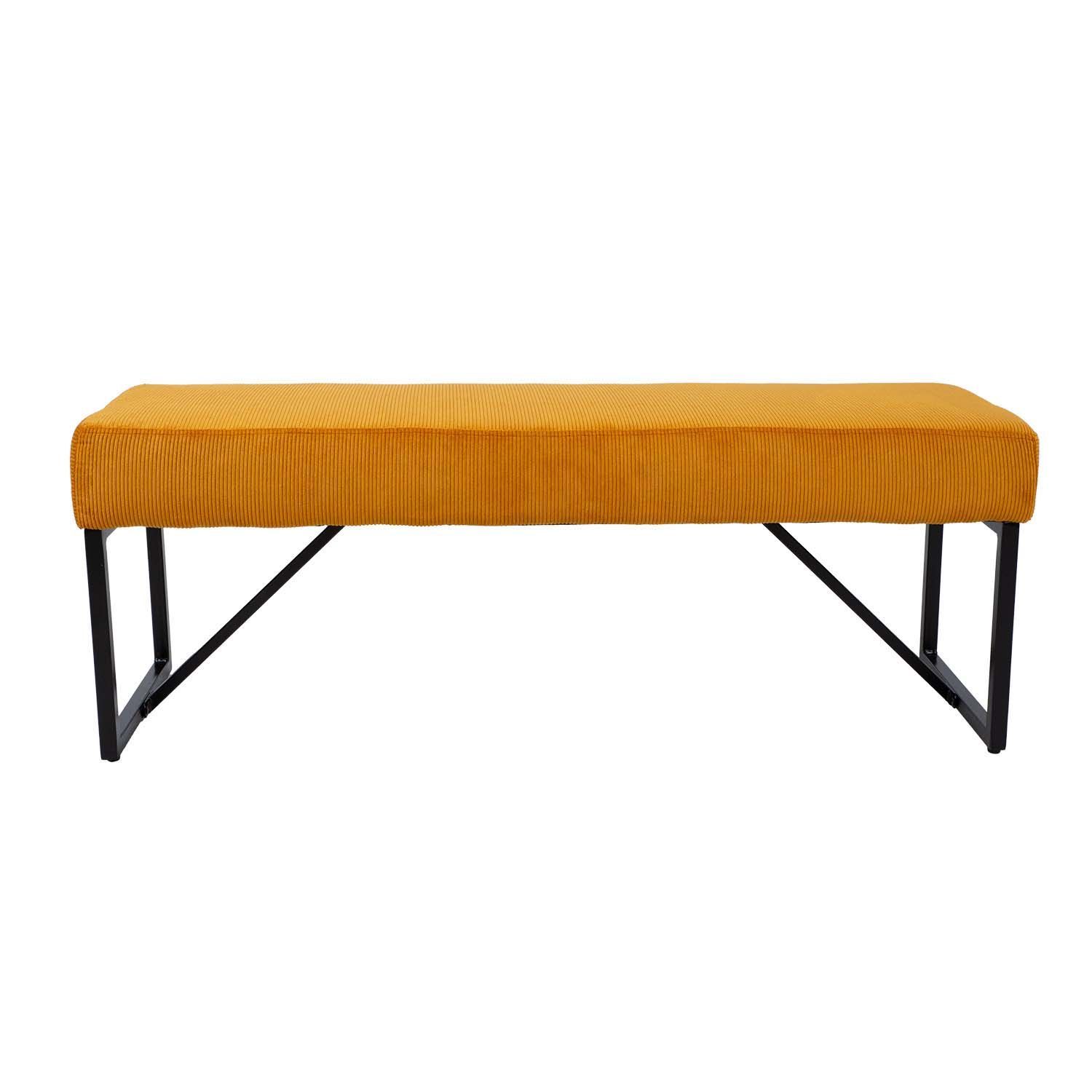 Pink MYLA 110x36x42cm, kollane velvet. Pingi iste on polsterdatud ja kaetud polüesterkanaga. Pingi jalad ja alusraam on valmistatud metallist ja viimistletud musta pulbervärviga.