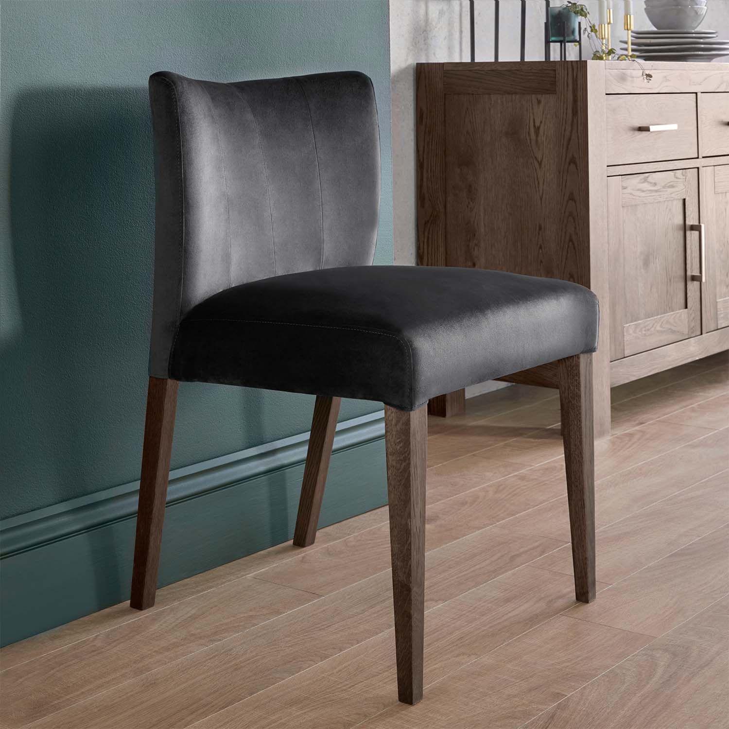 Tool TURIN 57x51xH80cm, tumehall sametkangas, tumedad tammepuidust jalad. Polsterdatud pehme iste ja seljatugi on kaetud sametkangaga. Toolijalad on valmistatud täistammepuidust. Kaalupiirang 120kg.