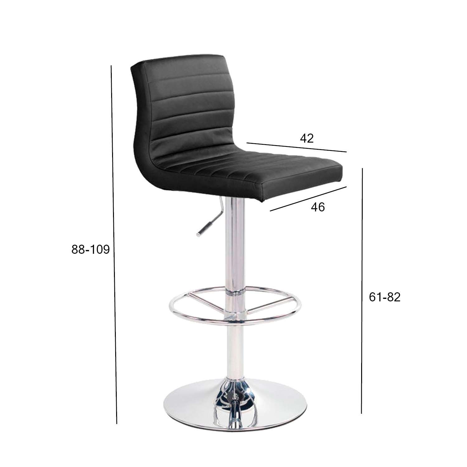 Baaripukk AURA 46x42xH88-109cm, must. Tooli polsterdatud iste on kaetud musta kunstnahaga. Toolil on kroomitud metallist jalg. Tooli kõrgus on reguleeritav gaasamordi abil. Istme kõrgus 88-109cm, istme laius 46cm, istme sügavus 42cm. Kaalupiirang 100kg.