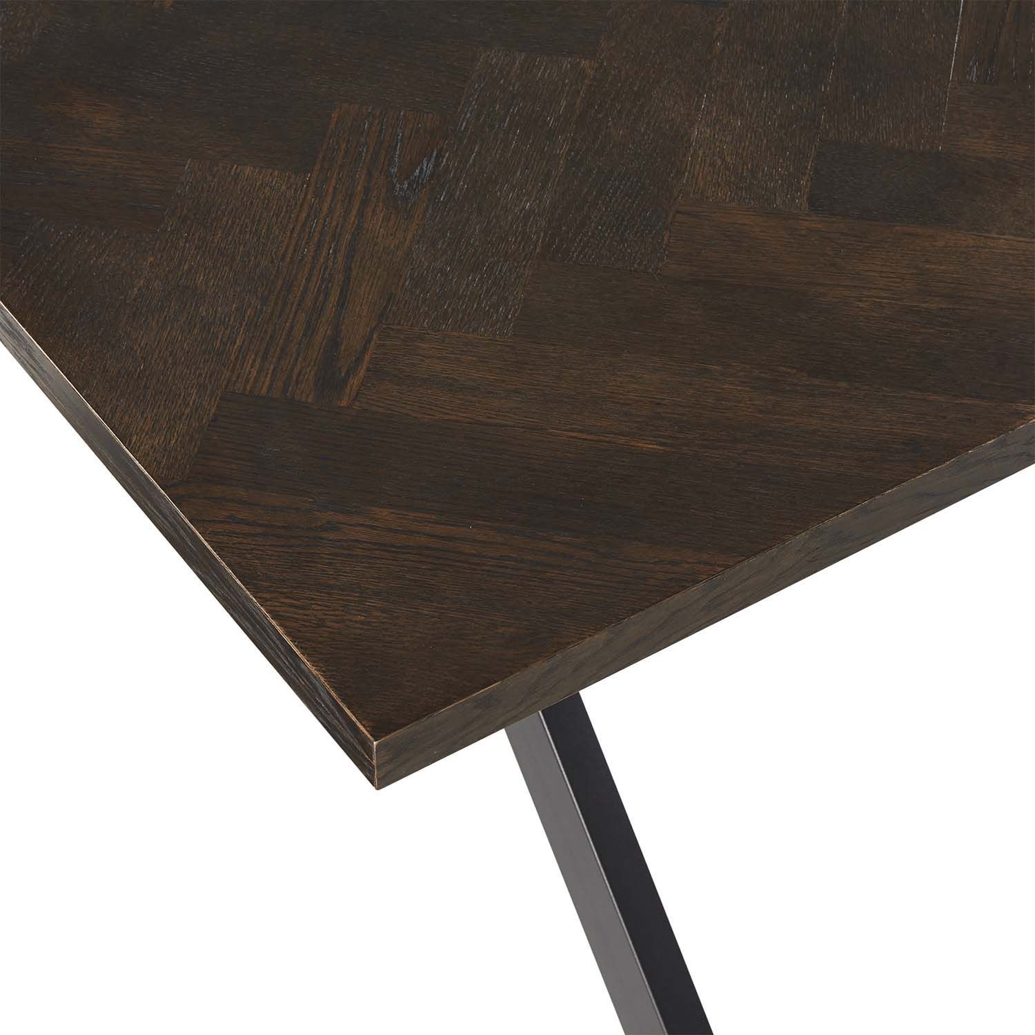 Söögilaud ROWAN 200x90xH75cm, kalasaba suitsutamm. Lauaplaat: kalasaba mustrisse laotud naturaalse tammespooniga mööbliplaat. Lauaplaat on viimistletud tumeda lakiga. Laua ristjalad on valmistatud metallist ja viimistletud musta pulbervärviga.