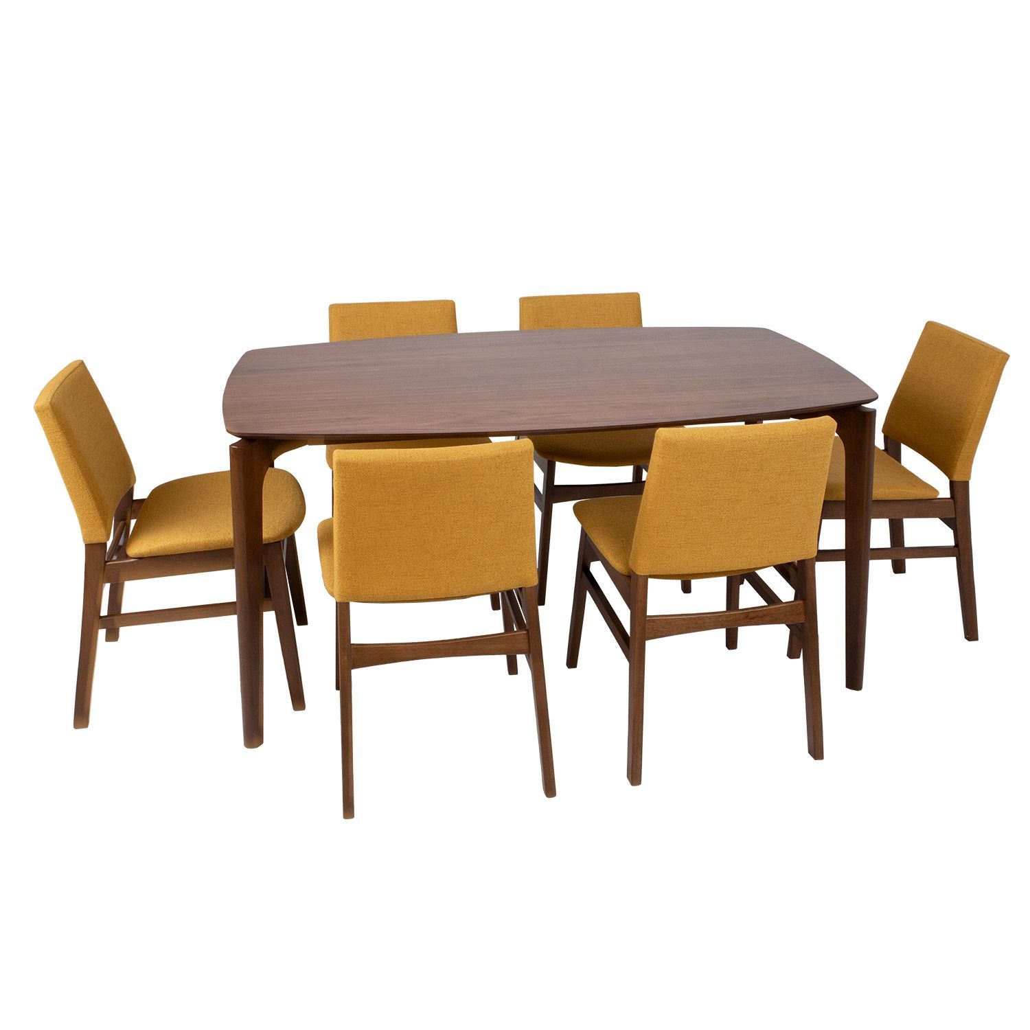 Söögilauakomplekt HAYDIE 6-tooliga. Söögilaua mõõdud on 150x90xH75cm. Lauaplaat: 18mm MDF naturaalse pähklispooniga. Jalad on valmistatud kummipuust. Laud on viimistletud pähkli tooni lakiga. Tooli mõõdud on 46x57xH79cm. Tooli iste ja seljatugi on kergelt polsterdatud ja kaetud kollase polüesterkangaga. Tooli jalad ja raam on valmistatud kummipuust ja viimistletud pähkli tooni lakiga. Kaalupiirang 120kg.