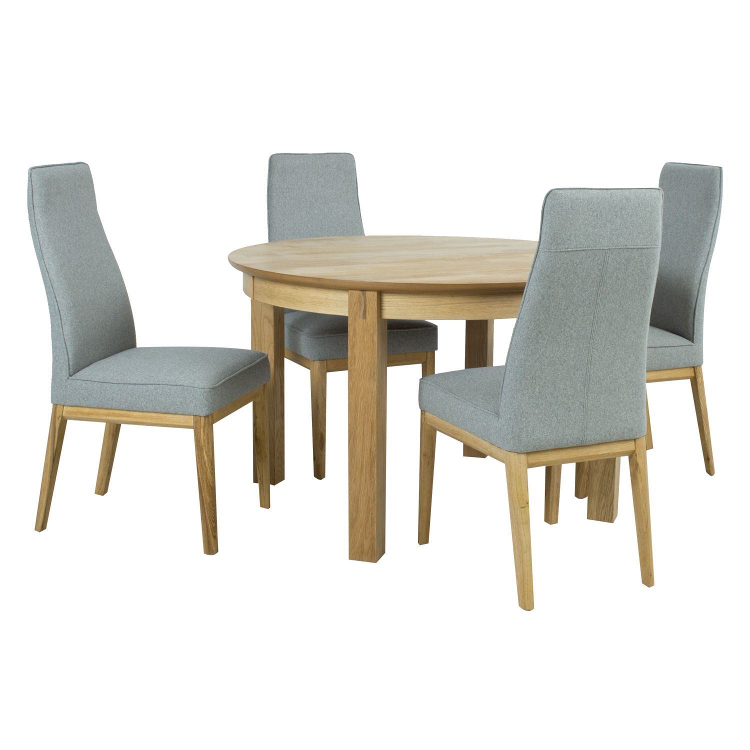 Söögilauakomplekt CHICAGO NEW 4 tooliga. Pikendatava söögilaua mõõdud on D120/160x120xH75cm. Lauaplaat: MDF kaetud naturaalse tammespooniga. Lauajalad (8x8cm) ja raam on valmistatud täispuidust ja kaetud naturaalse tammespooniga. Laud on viimistletud puiduõliga. Laud on keskelt pikendatav. 40x120cm pikendusosa on paigutatud lauaplaadi alla. Laua pooled liiguvad metallsiinidel. Tooli mõõdud on 46x58,5xH102cm, hall. Tooli iste ja seljatugi on polsterdatud ja kaetud halli polüesterkangaga. Jalad ja alusraam on valmistatud tammepuidust. Istme kõrgus 48cm. Kaalupiirang 100kg. HOOLDUS: naturaalse spooniga kaetud lauaplaat on väga tundlik niiskuskahjustuste ja temperatuuri suhtes. Kasutage alati lauanõude all alusmatte ja kuumaaluseid. Igasugune lauale sattunud vedelik tuleb koheselt kuivatada pehme lapiga. Vältige liigset hõõrumist ja abrasiivseid puhastusvahendeid.