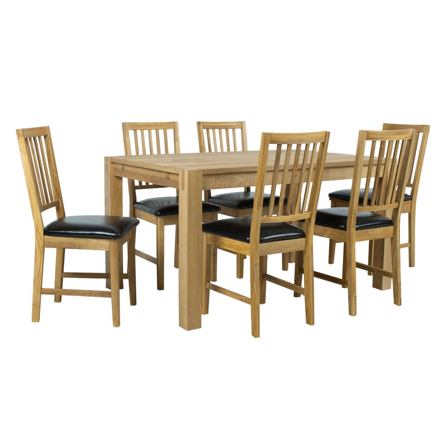 Söögilauakomplekt CHICAGO NEW laud ja 6 tooli. Laua mõõdud on 140x90xH76cm. Lauaplaat: MDF naturaalse tammespooniga. Lauajalad ja -raam on valmistatud madalama klassi täispuidust ja kaetud tammespooniga. Lauajala mõõdud on 8x8cm. Laud on viimistletud puiduõliga. Tooli mõõdud on 43x42xH94cm. Tooli iste on kergelt polsterdatud ja kaetud musta kunstnahaga. Tooli jalad ja raam on valmistatud täistammepuidust ja viimistletud puiduõliga. Kaalupiirang 120kg. Lauale on võimalik juurde osta pikendus 45x90cm koodiga 84026. Pikendus on võimalik paigaldada laua mõlemasse otsa. HOOLDUS: naturaalse spooniga kaetud lauaplaat on väga tundlik niiskuskahjustuste ja temperatuuri suhtes. Kasutage alati lauanõude all alusmatte ja kuumaaluseid. Igasugune lauale sattunud vedelik tuleb koheselt kuivatada pehme lapiga. Vältige liigset hõõrumist ja abrasiivseid puhastusvahendeid.
