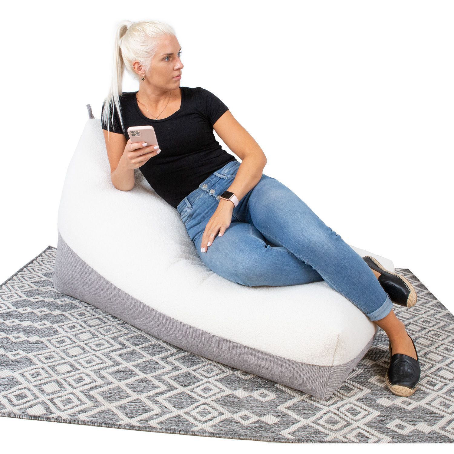 Kott-tool LAMB BAG, 130x80x20/70cm, valge/helehall, 100% polüester, kangas 323/321. Kott-tool on täidetud spetsiaalsete graanulitega, mis kohanduvad istuja kehakujuga, pakkudes mõnusat tuge seljale. Graanulid on turvaliselt sisekotis ja vajadusel saab neid lihtsalt juurde lisada. Kott-tool sobib hästi igasse interjööri, nii koju kui kontorisse, nii elu kui lastetuppa.