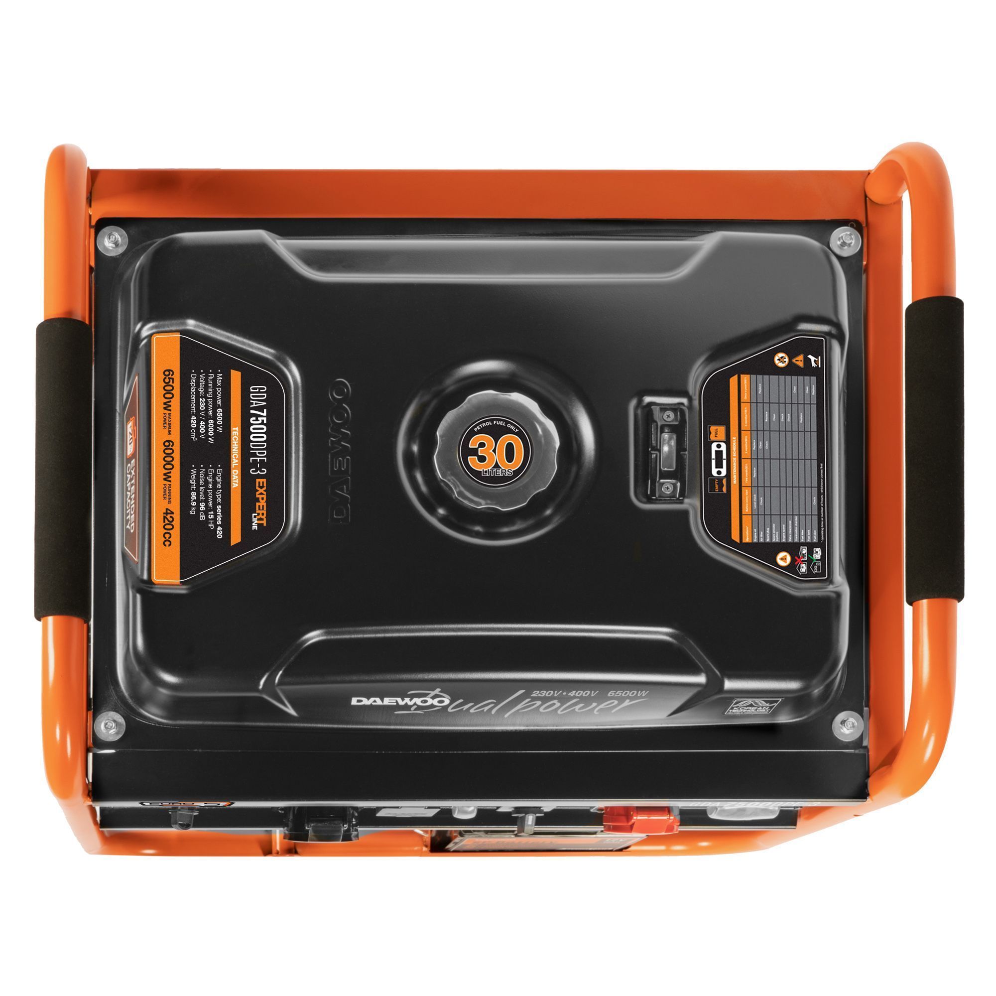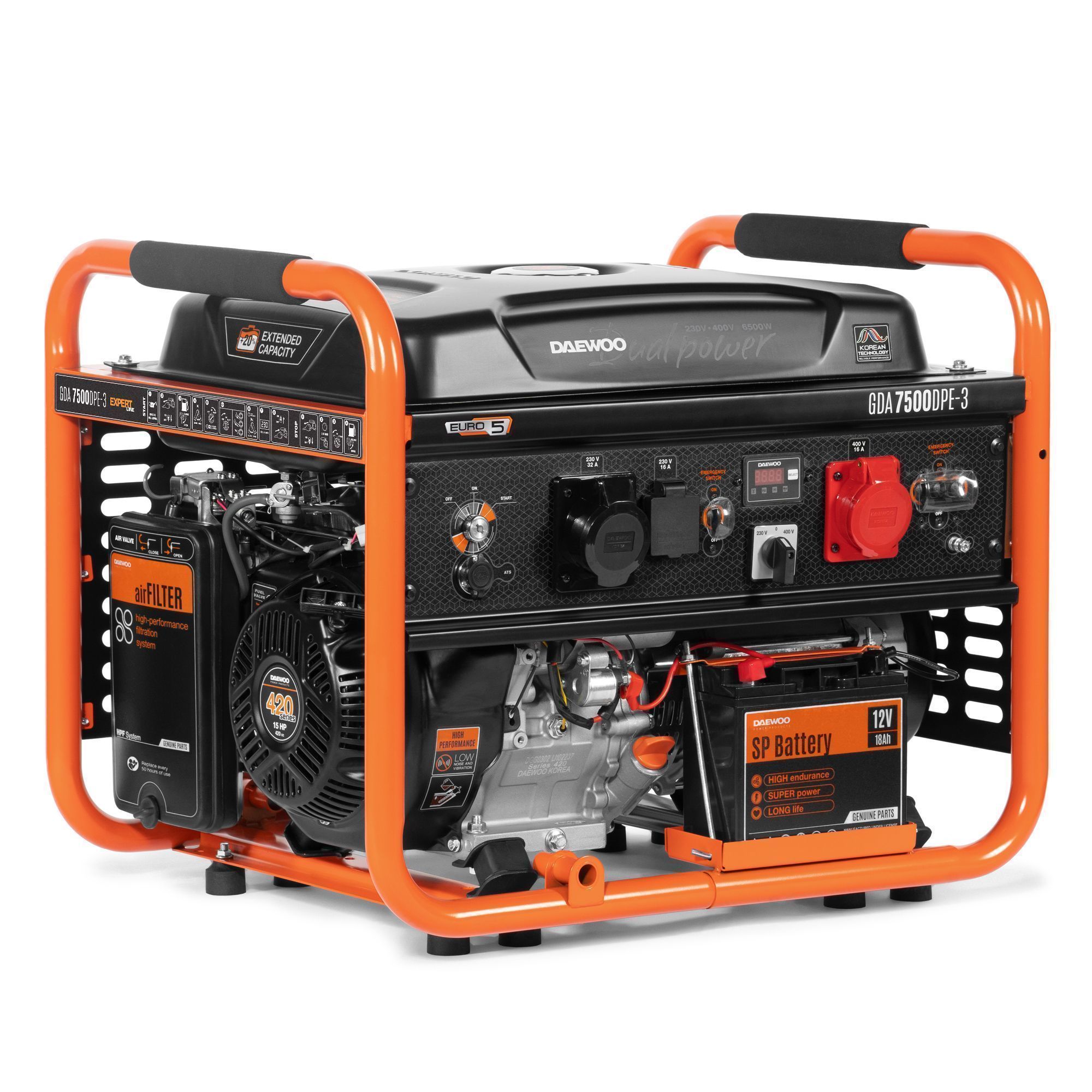 Daewoo bensiinimootoriga generaator GDA 7500DPE-3. Generaator kasutab täiustatud DUAL POWER tehnoloogiat. Uus generaatori disain võimaldab pakkuda võrdväärselt kõrget võimsust mõlemas režiimis - 230 V ja 400 V, samal ajal kui tavalised kolmefaasilised elektrijaamad suudavad pakkuda maksimaalselt 30% võimsusest ühefaasilistele tarbijatele. Generaator on varustatud lisateraškilpidega, mis kaitseb generaatori komponente mehaaniliste kahjustuste eest. Kaitse on soovitatav ehitusprojektide puhul. Sisseehitatud elektriline starter ja aku muudavad generaatori käsitsemise lihtsamaks operaatoritele, võimaldades seda käivitada süütevõtme keeramisega ilma käivitusnööri tõmbamata. Võti muudab käivitamise kasutajate jaoks lihtsaks ja mugavaks.