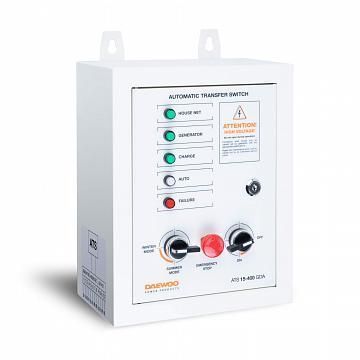 Daewoo automaatjuhtimisseade ATS 15-400. Automaatne ümberlülituslüliti käivitab mootori automaatselt pingekadu või voolukatkestuse ajal. Pärast toiteallika taastamist lülitab ATS tarbijate varustuse välisele võrgule ja lülitab generaatori välja. ATS on varustatud mugava seinakinnitusega. Kõik elektroonilised osad ja paigaldusosad on metallkorpuses, mida saab võtmega avada. Ühilduv mudelitega: DAEWOO GDA 7500E-3, 7500DPE-3, 8500E-3, 9500DPE-3.