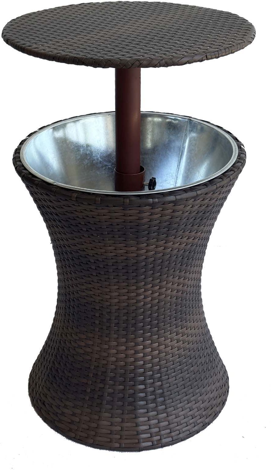 Jahutuslaud jookidele PE rotang + metallraam + hõbedane metallpott. Reguleeritav kõrgus kuni 85 cm. Sisemine maht on 13 l. Mõõtmed on Φ44 x L44 x H55/85 cm.