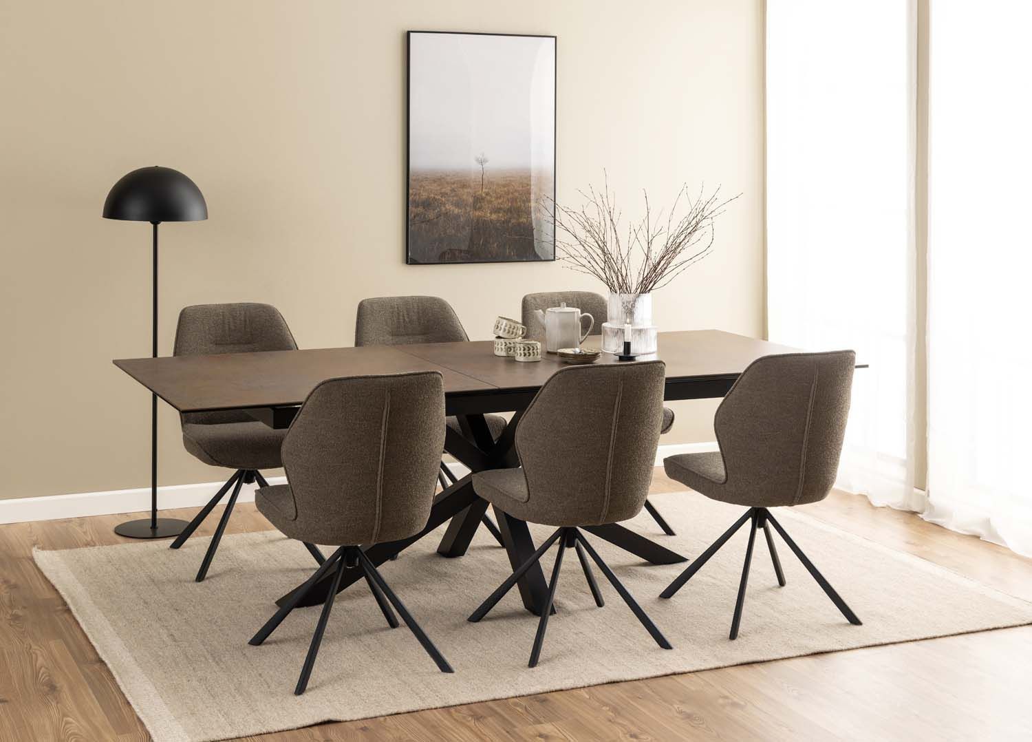 Kuumus- ja kriimustuskindel roostepruun karekeraamiline lauaplaat. Lisatud keraamiline pikendusplaat. Panipaik pikendusplaadi jaoks, kui seda ei kasutata. Must pulbervärvitud metallist ristalus. Pikendatuna mahutab mugavalt 10 inimest. Toote mõõdud on 200/240x100xH76cm.
