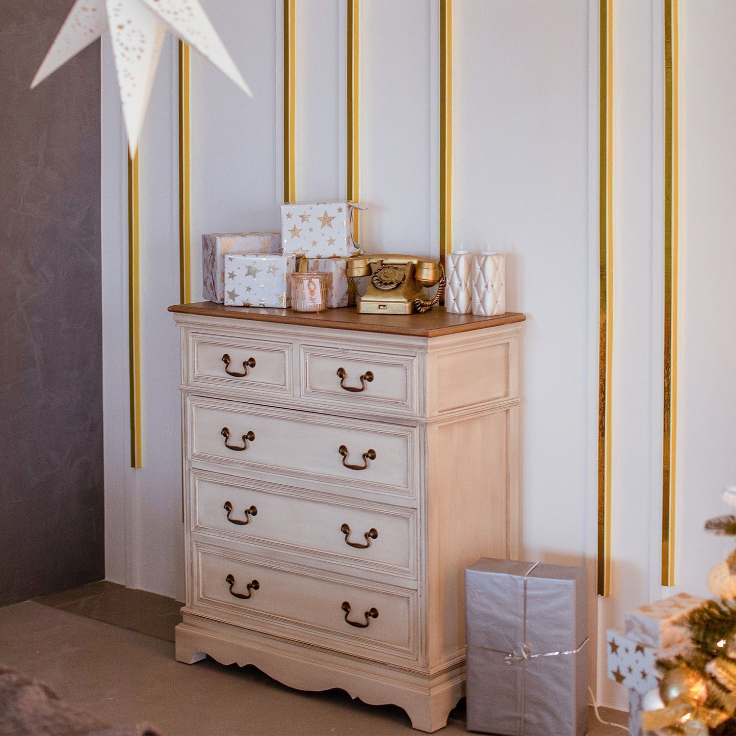 Kummut SAMIRA 5-sahtliga 86,5x39xH95cm, antiikvalge/naturaalne. Kummuti põhikonstruktsioon ja sokkel on valmistatud saarepuidust, MDF küljepaneelid. Kummut on viimistletud antiikvalge värviga. Kummuti pealmine MDF plaat on kaetud naturaalse paulownia spooniga. Metallist käepidemetega sahtlid on ilma siinideta.