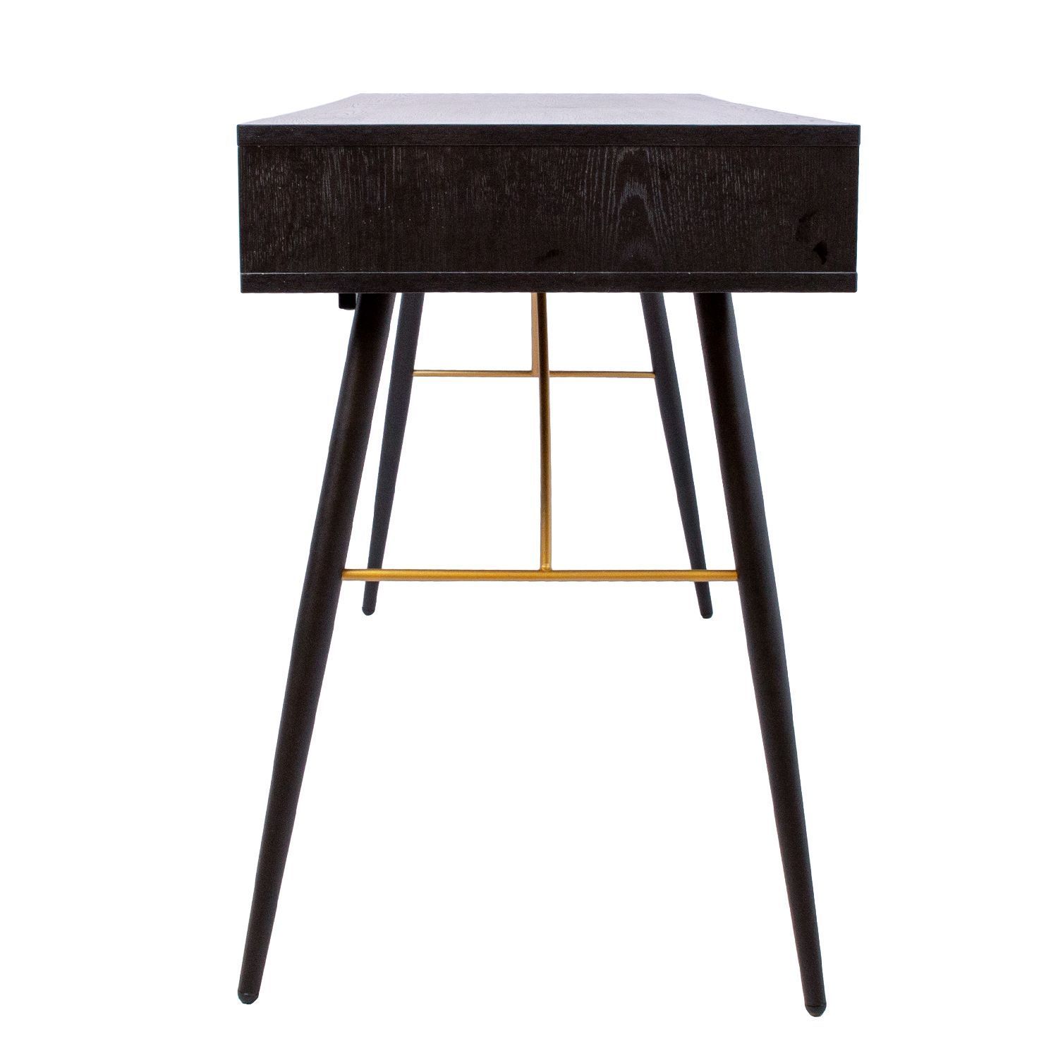 Kirjutuslaud LUXEMBOURG 120x48xH75cm, must melamiin. Laud on valmistatud puidudekooriga melamiinkattega mööbliplaadist. Lauajalgu seovad vasevärvi metallist detailid, mis annavad lauale stiilse välimuse ja samas tagavad aluskonstruktsiooni tugevuse. Lauaplaadi all on kaks sahtlit. Sahtlisiinid on vaikselt sulguvad. Sahtlitel on vasevärvi alumiiniumust nupud. Lauajalgade kõrgus on 62cm.