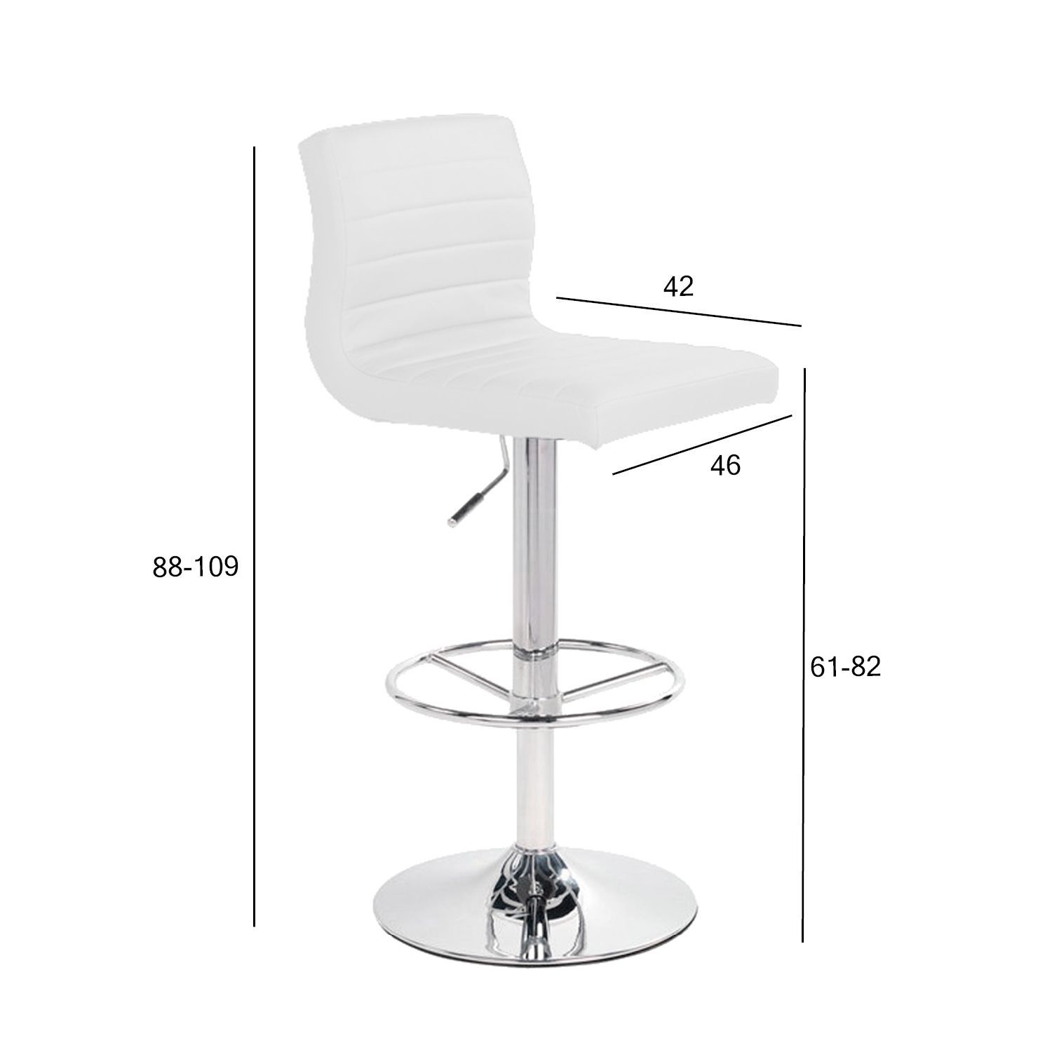 Baaripukk AURA 46x42xH88-109cm, valge. Tooli polsterdatud iste on kaetud musta kunstnahaga. Toolil on kroomitud metallist jalg. Tooli kõrgus on reguleeritav gaasamordi abil. Istme kõrgus 88-109cm, istme laius 46cm, istme sügavus 42cm. Kaalupiirang 100kg.