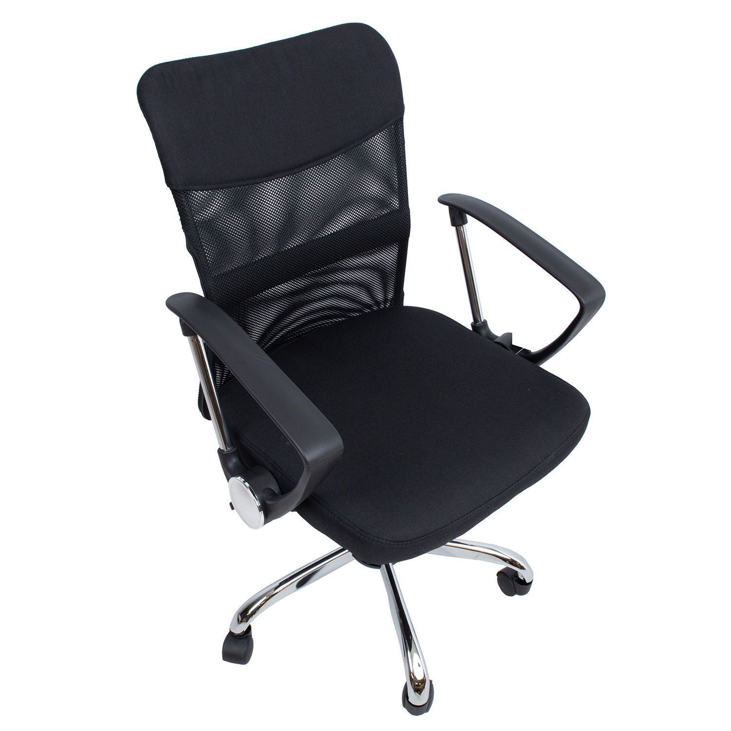 Töötool DARIUS must. Kergelt polsterdatud tooli iste ja seljatoe ülemine osa on kaetud polüesterkangaga. Seljatoe keskmine osa on kaetud polüestervõrkkangaga. Toolil on kiikemehhanism, lukustatav ühes positsioonis. Istme kõrgus on reguleeritav gaasamordi abil. Käetoed on plastikust ja metallist. 5-haruline jalarist on metallist, R30cm. Toolil on plastikrattad, 50mm. Tooli kõrgus on 93-103cm, istme laius 47cm, istme sügavus 46cm, seljatoe laius 43,5cm, seljatoe kõrgus 58cm. Toote mõõdud on 57x57xH93-103cm. Tooli kaalupiirang on 100kg.