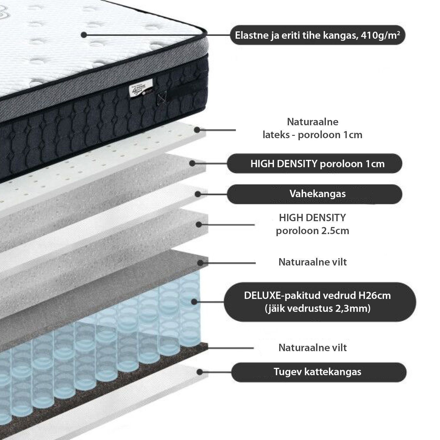 Voodi TEXAS madratsiga HARMONY DELUX 160x200cm, hallhall. Voodi peatsi puidust ääred on kaetud naturaalse okoume spooniga ja viimistletud tumeda pähklitoonis lakiga. Polsterdatud ja kangaga kaetud peats võimaldab voodis mõnusalt lugeda või telerit vaadata. Küljepaneelid kaetud halli polüesterkangaga. Komplekt sisaldab voodi põhjalippe ja madratsit HARMONY DELUX. Jäigema vedrustusega ja naturaalse lateksi kihiga kvaliteetne vedrumadrats on kõrgusega 30cm. Madratsil on pakitud deluxe-pocket vedrustus (2,3mm/jäik). Hele stretch-kangast madratsikate on nahasõbralikust ja pehmest puuvilla-polüestrist (kangakaal 410g/m²). Madratsis on pealmiseks kihiks naturaalne lateks, mis on pehme, elastne, õhku läbilaskev ning reguleerib ise oma niiskussisaldust. Lisaks on madratsis kaks erinevat kvaliteetset poroloonikihti, mis tagavad lihaste ja luustiku maksimaalse lõdvestuse. Kangas, vilt ja vatiin vastavad rahvusvahelisele Öko-Tex 100 standardile. Madrats on pakitud rulli, et seda oleks lihtsam transportida. Madrats vajab oma esialgse kuju taastamiseks kuni 2 tundi aega. Eemaldage ettevaatlikult kilepakend ja asetage madrats voodile. Madratsi mõõdud on 160x200xH30cm. Voodi üldmõõdud on 167x210xH114,5cm.