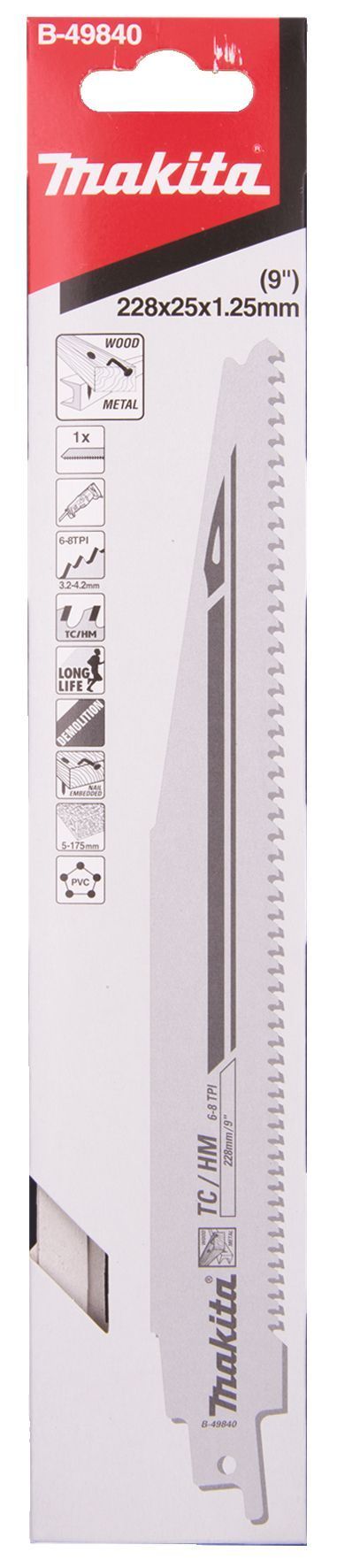 Makita volframkarbiid hambaotstega saetera, mis on väga vastupidav hõõrdumisele ja ülekuumenemisele. Sobib erinevate materjalidele. Freesitud ja laineline tera peenteks ja täpseteks lõigeteks. Hambad on freesitud ja paigutatud laineliselt. Volframkarbiidist ja kõvasulamist tera üldpikkus on 228 mm ja tööpikkus 205 mm. Tera paksus on 1,25 mm ja 6–8 hammast tolli kohta (TPI). Pakendis on 1 tera.
