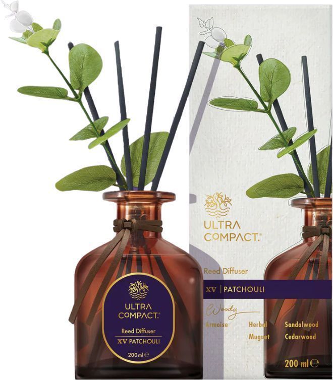 ULTRA COMPACT kodulõhnastaja PATCHOULI 200 ml. Täiuslik kodulõhnastaja romantilise õhkkonna loomiseks ja ümbritsevale elegantsi lisamiseks. Pakitud kaunisse karpi, mis sisaldab ka dekoratiivset taimeoksa. Lõhnabukett: puju, sandlipuu, piibeleht, seedripuu.