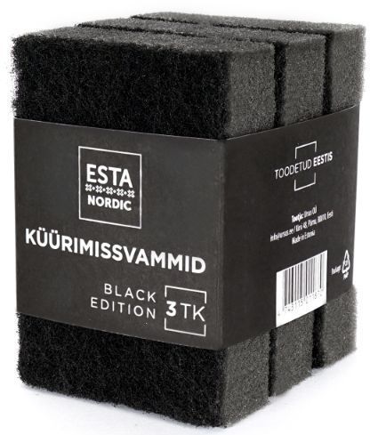 Esta küürimissvammid Nordic Black Edition. Küürimissvammid on valmistatud tihedast, vastupidavast poroloonist. Poroloon on toodetud kasutades 100% rohelist energiat. Svammid puhastavad efektiivselt ka tugeva mustuse. Ei sobi õrnade pindade nagu klaas ja teflon puhastamiseks. Svammid on stiilse, minimalistliku välimusega ning sobivad põhjamaise kujundusega kööki. Pakis on 3 tk.