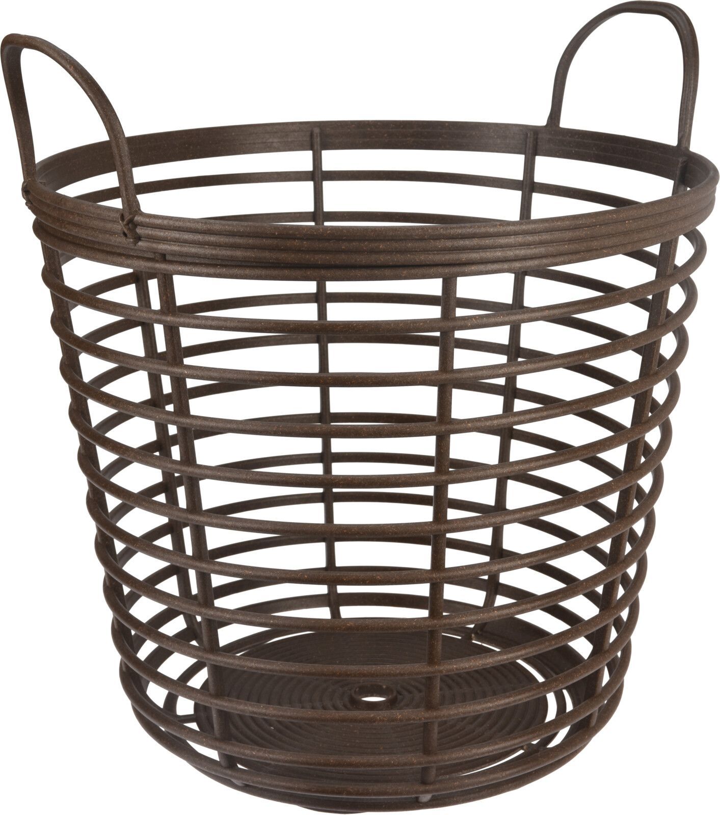 Sangadega punutud korv mõõtmetega 43 x 46 cm.