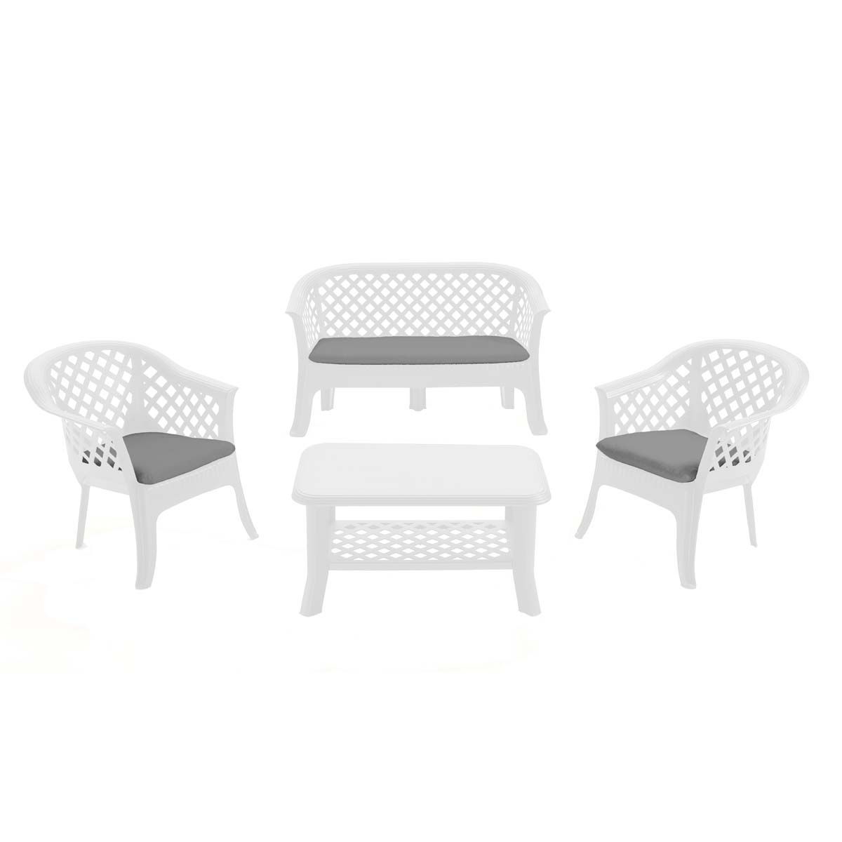 Progarden Veranda aiamööblikomplekt. Komplektis on 1 diivan, 2 tugitooli, 1 laud ja istmete padjad. Mõõdud: DIIVAN 134 x 72 x 76 cm, TUGITOOL 72 x 72 x 76 cm, LAUD 90 x 60 x 46 cm. Materjal: polüpropeen. Värv: valge.