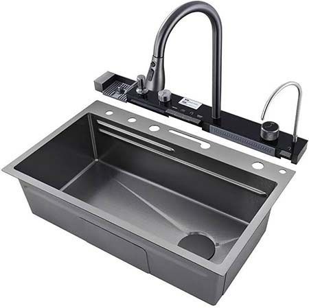 Köögivalamul on sisseehitatud klaasiloputaja, seebidosaator, joareguleerimise nupp (segisti ja juga-kujuline valamu), nupp äravoolu sulgemiseks ja avamiseks ning väljatõmmatav segisti, mis pöörleb 360 kraadi ja on väljatõmmatav kuni 50 cm. Valamu kõrval saad ka lõikelaua lisatööpinna jaoks ja 2 lisakaussi, mis sobivad valamusse - üks leotamiseks, teine loputamiseks. Valamu sobib suurepäraselt igasse kööki, kuid on eriti kasulik väiksemates köökides, kus tööpinda napib, kuna komplektis on äärmiselt praktilised tarvikud. Komplekti kuulub valamu, kraan, segisti, loputus, auguline põhjakaus, suletud põhjakauss, lõikelaud, seebidosaator, paigalduskomplekt (sifoon, ventiilid, voolikud).