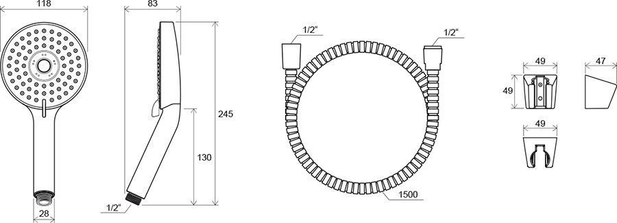 Käsidušiotsik: läbimõõt 118 mm, 3 režiimi - "Rain", "Jet", "Soft"