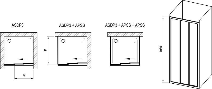 Toode koosneb ühest liikumatust ja kahest liikuvast osast. Keerates toodet 180°, saab vasaku/parema sisenemisvõimaluse. Paigaldatakse vannitoa plaaditud nurka alusele RAVAK ANETA, ANGELA, PERSEUS, PERSEUS PRO, PERSEUS PRO FLAT, PERSEUS PRO CHROME, GIGANT PRO, GIGANT PRO FLAT, GIGANT PRO CHROME või otse põrandale sisse ehitatud dušikanaliga. Kombineerides ühe liikumatut seina tüüpi APSS ja dušiukse, on võimalik luua П-kujuline dušinurk. Supernova seeria dušikabiinid ja -uksed tarnitakse valmiskujul ja neid saab üks inimene kokku panna vaid ühe tunni jooksul. Kahe APSS tüüpi liikumatu seina ja dušiukse abil moodustub L-kujuline dušinurk.