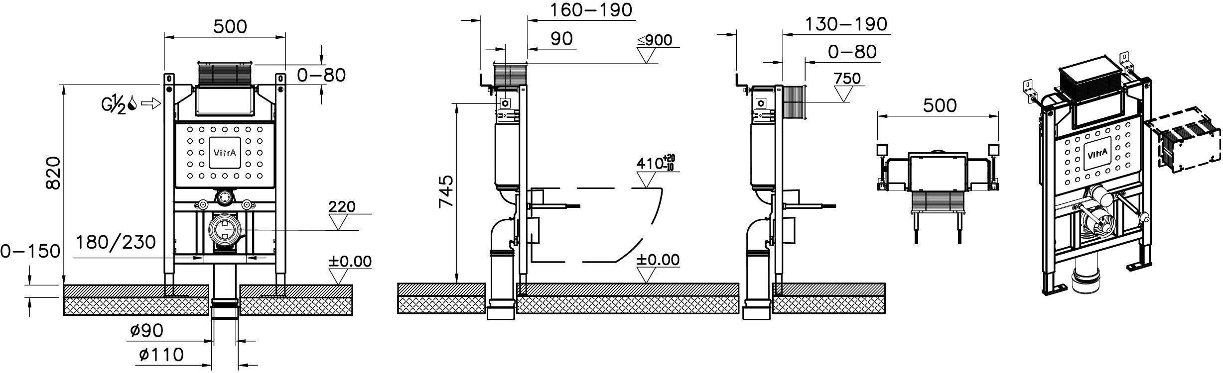 Vitra WC montaažielement seinapotile. WC poti kinnitusavade vahe 180/230mm, võimalus paigaldada loputusklahv elemendi peale. Komplektis on vee sisse-ja äravoolu kaitse seinakinnitused.