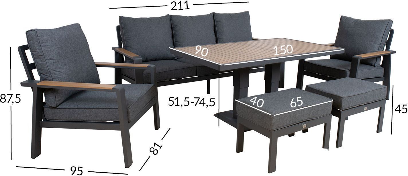 Komplekti kuulub muudetava kõrgusega laud, 3-kohaline diivan, 2 tugitooli ja 2 tumbat.