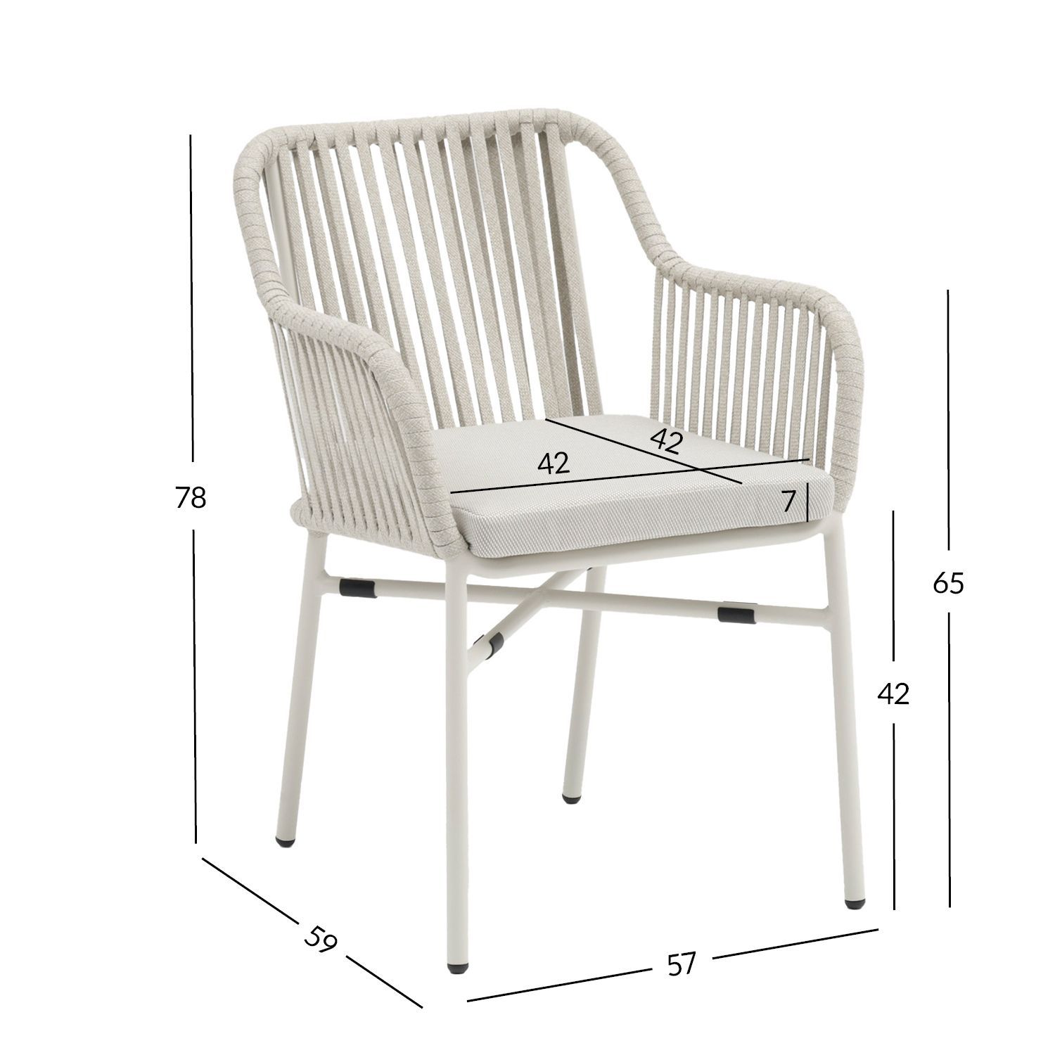 Tool MELROSE beež. Tooli raam ja jalad on valmistatud alumiiniumist ja viimistletud beeži pulbervärviga. Tooli selja- ja käetoed on kaetud nöörist punutisega. Istmepadi kuulub komplekti. Padjakate on valmistatud polüesterkangast. Padja mõõdud on 42x42xH7cm. Istmepõhi on toestatud alumiiniumliistudega. Tooli üldmõõdud 57x59xH78cm. Istme kõrgus raami ääreni 42cm. Käetoe kõrgus maast 65cm. Kaalupiirang 100kg. Toolid on virnastatavad ning nende hoiustamine on lihtne ja ruumi säästev. Toode on muutlikes ilmastikutingimustes vastupidav ja lihtsalt hooldatav. HOIUSTAMINE: suvehooaja lõppedes soovitame aiamööblit hoiustada siseruumides. Puhastage ja kuivatage mööbel enne hoiule panekut. Kasutage hoiustamiseks kuiva ning hea ventilatsiooniga ruumi.